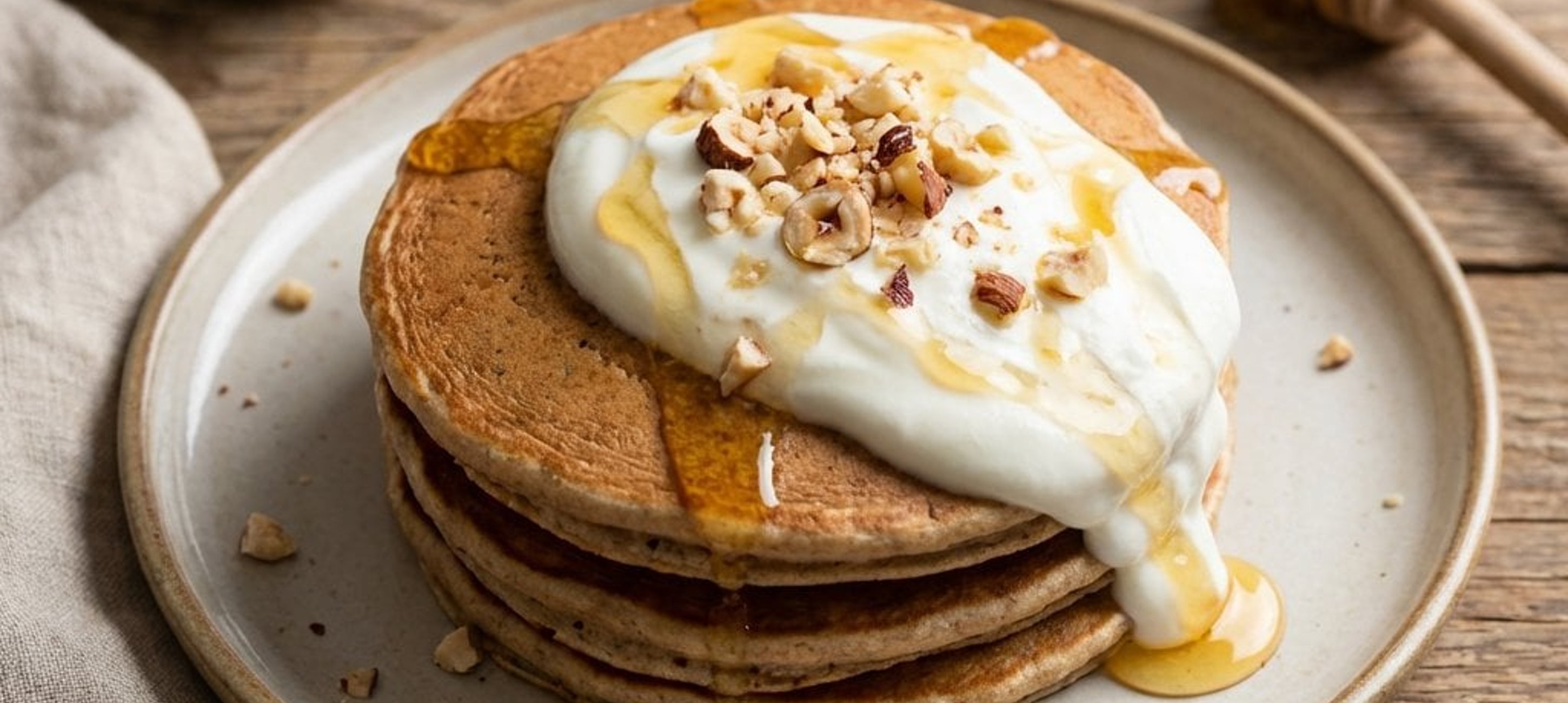 - 4A kész palacsintákat tálalja natúr joghurttal, csorgasson rájuk mézet, és szórja meg durvára vágott törökmogyoróval.