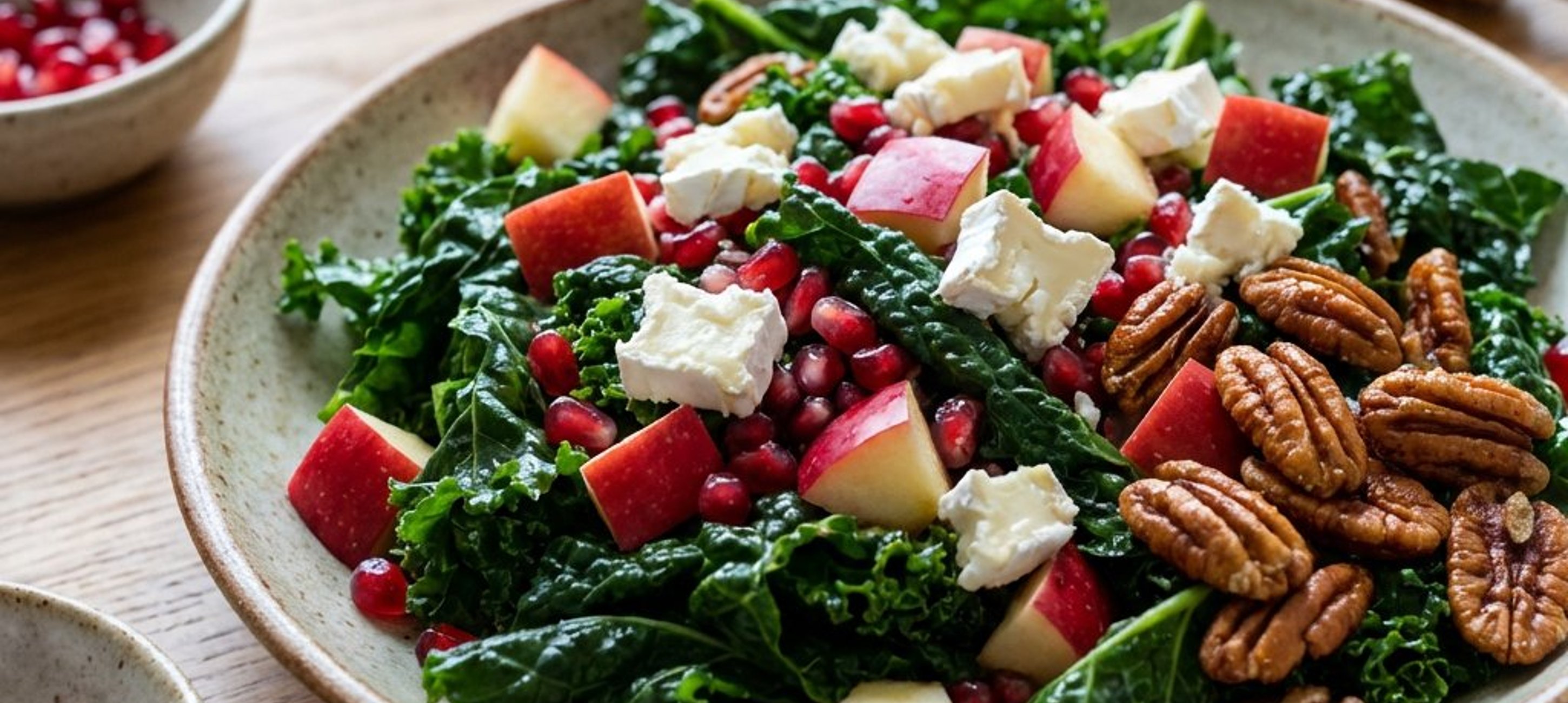 - 4A lecsöpögtetett fodros kelt keverjük össze az öntettel, majd tálaljuk az almával, a gránátalma magokkal, a karamellizált pekándióval és a kecskesajttal a tetején.