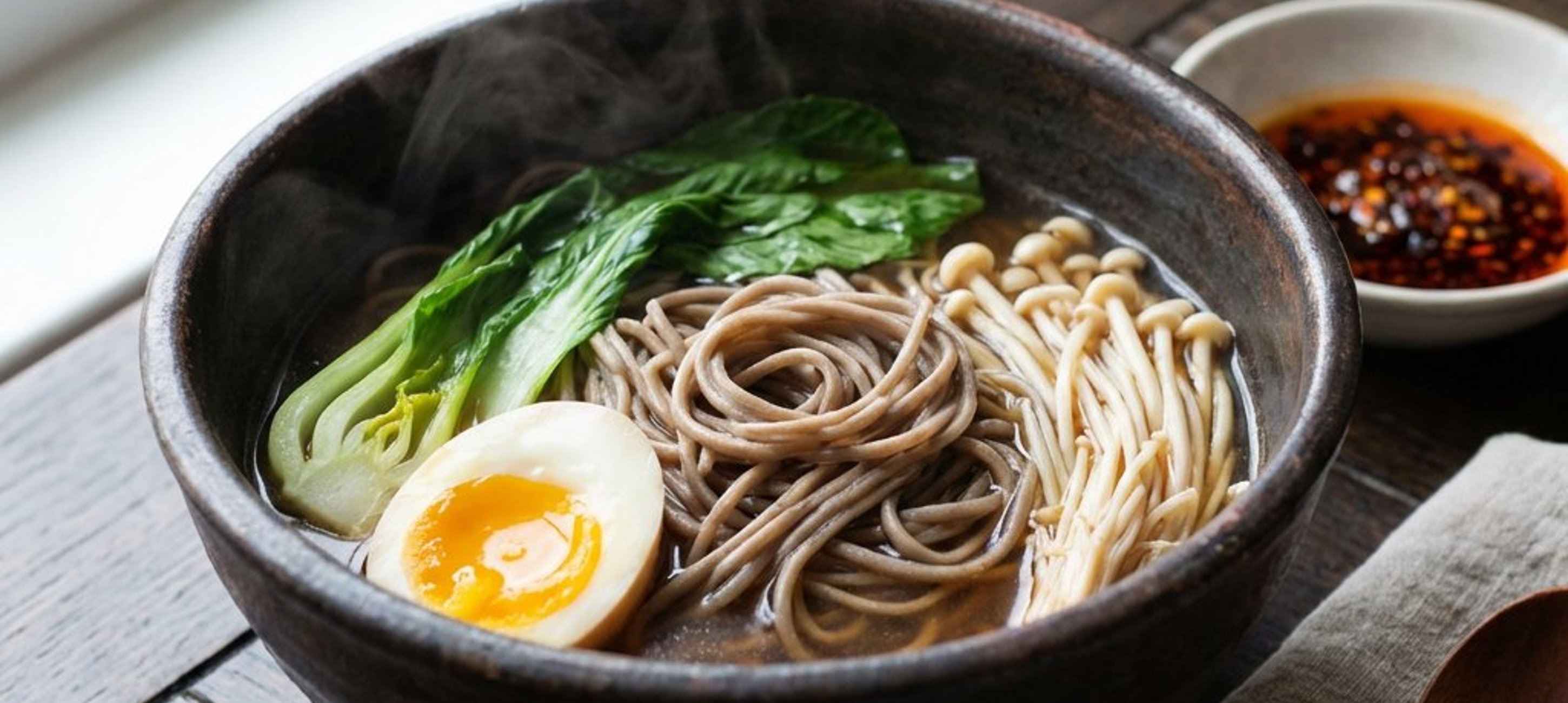 A soba tészta hajdina alapú, így különleges, diós ízt ad a levesnek. Ügyeljünk rá, hogy ne főzzük túl!