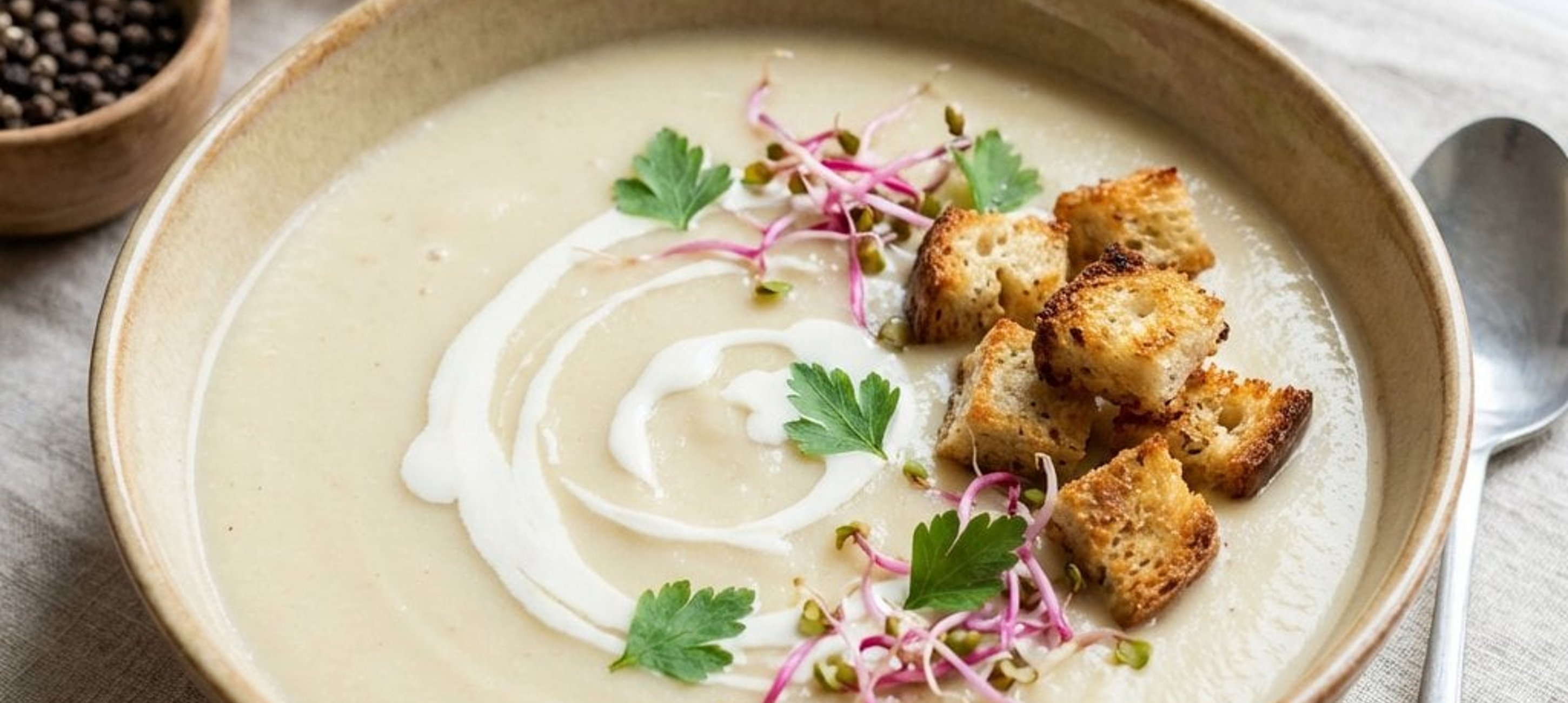 - 3A megfőtt levest tegyük turmixgépbe, és alaposan turmixoljuk össze. A turmixgép használatával érhetjük el a legkrémesebb és leglevegősebb állagot, de botmixert is használhatunk. Végül keverjük hozzá a tejfölt, és ízesítsük egy csipet őrölt szerecsendióval.