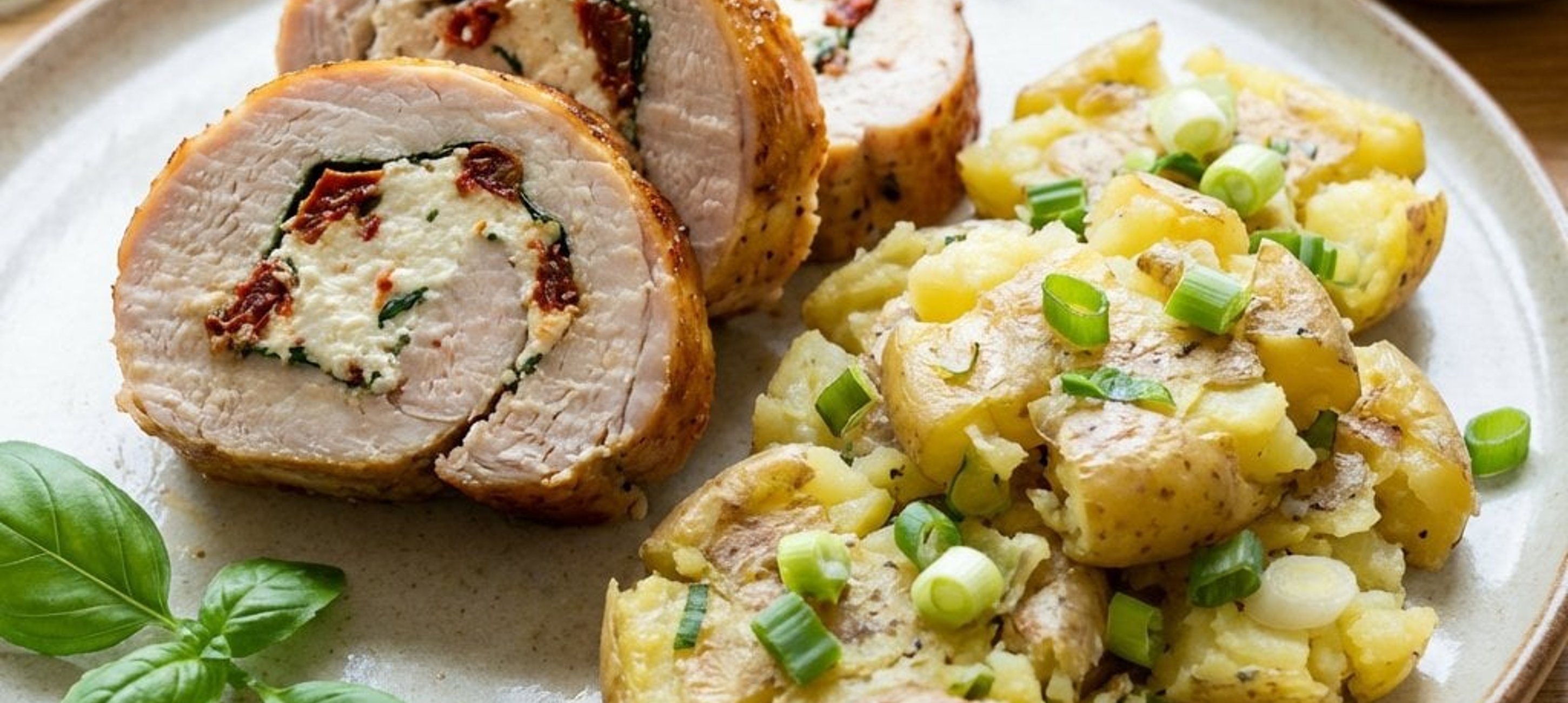 - 4A pulykaroládot szeletelje fel, és tálalja az újhagymás tört burgonyával.