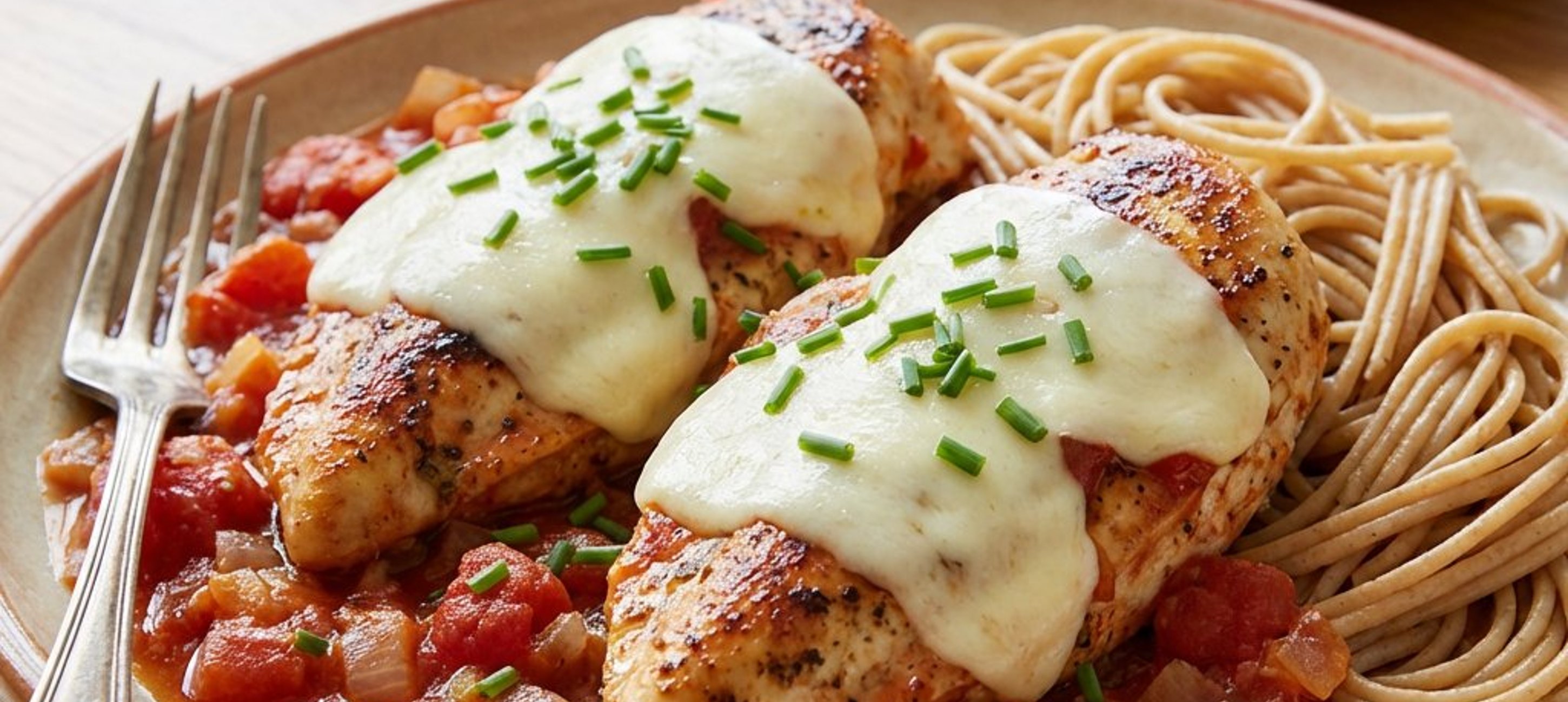 - 3Helyezzük vissza az elősütött csirkemelleket a serpenyőbe a mártásba, és mindegyik tetejére tegyünk mozzarella szeleteket (vagy reszelt sajtot). Fedjük le a serpenyőt, és közepes lángon hagyjuk 3-4 percig, amíg a sajt szépen ráolvad és a hús teljesen átsül. Tálaljuk a kifőtt teljes kiőrlésű tésztával.