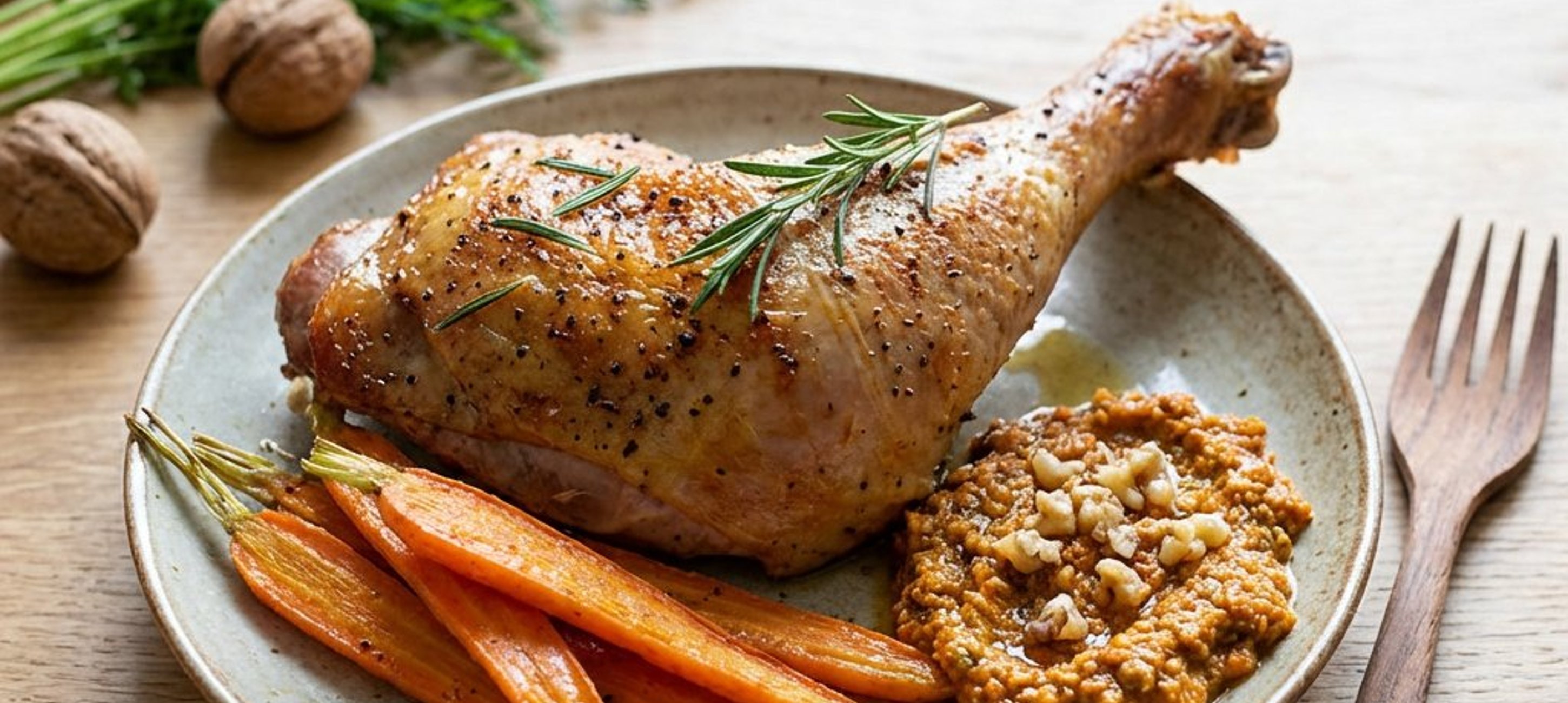- 3Amíg a hús and a répa sül, készítsük el a pestót. Egy turmixgépben mixeljük össze a sárgarépa zöldjét 2 evőkanál napraforgóolajjal, a dióval, egy kevés sóval, borssal és a maradék 1 gerezd fokhagymával. Tálaláskor kínáljuk a pestót a sült pulykacomb és a sárgarépa mellé.