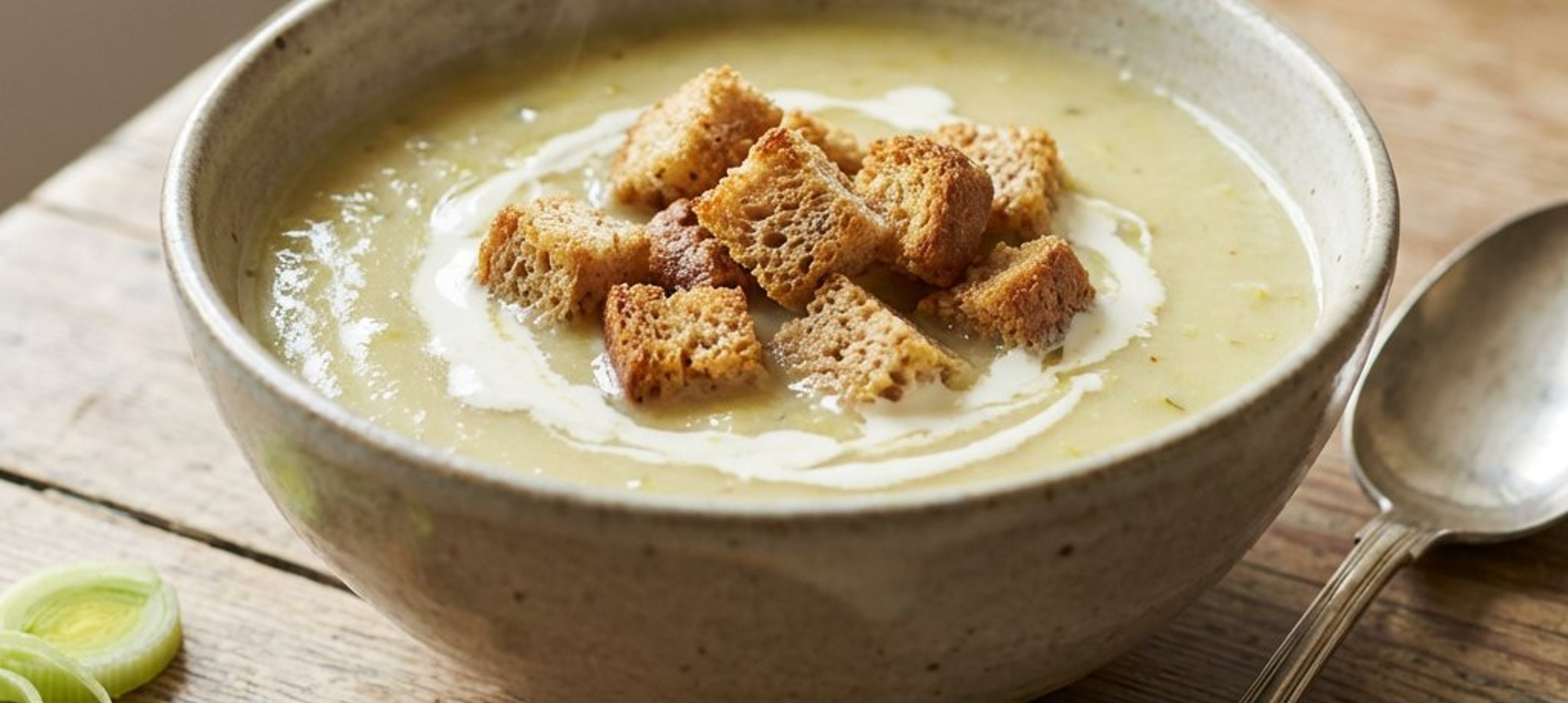 - 4A megfőtt levest vegyük le a tűzről, és botmixerrel pürésítsük teljesen simára. Keverjük hozzá a főzőtejszínt, majd ízesítsük sóval és borssal. Osszuk szét 4 tányérba, szórjuk meg a frissen pirított krutonnal, és melegen tálaljuk.
