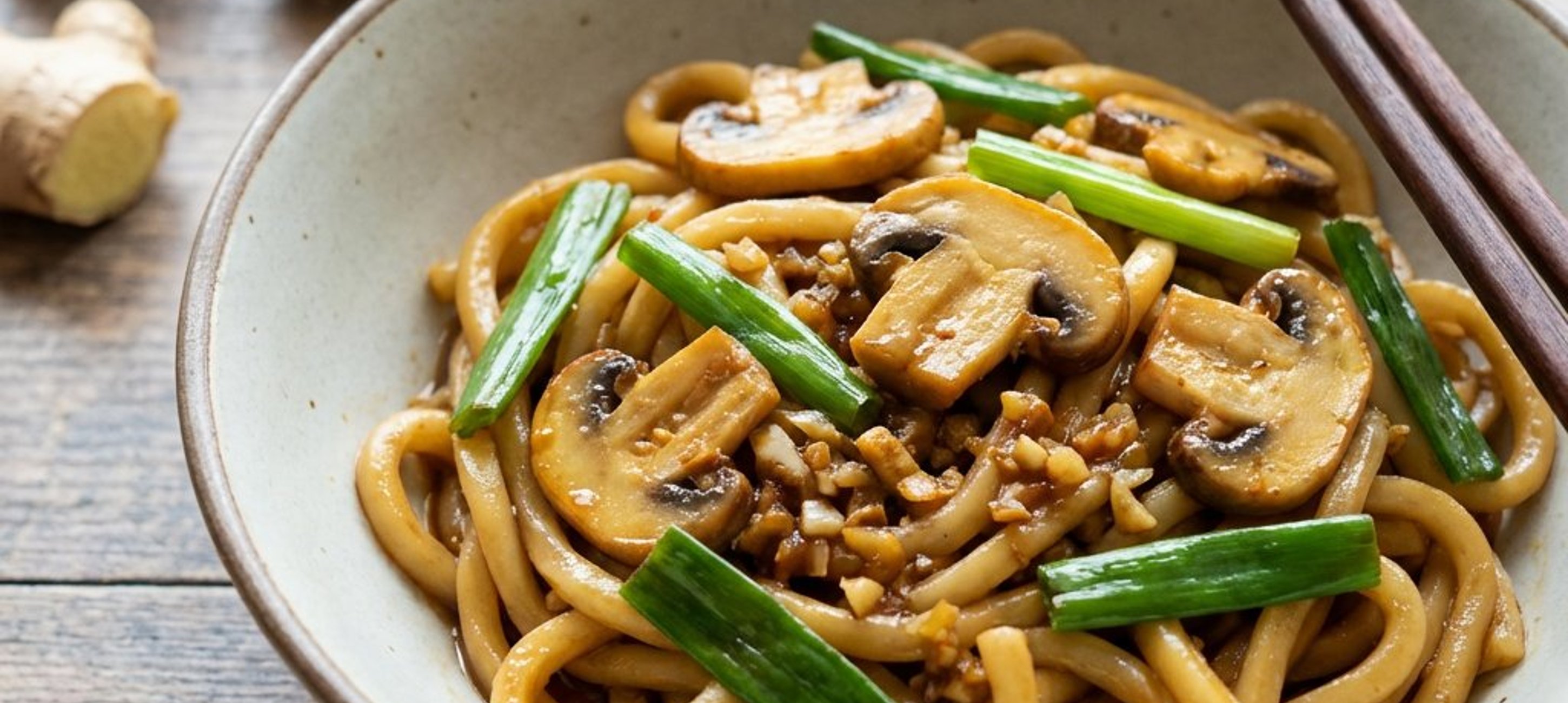 - 3A gombához adjuk hozzá a finomra vágott fokhagymát és gyömbért, szórjuk rá a cukrot, és öntsük hozzá a szójaszószt. Ezután adjuk hozzá a nagyobb darabokra vágott újhagymát, és pirítsuk együtt további egy percig.