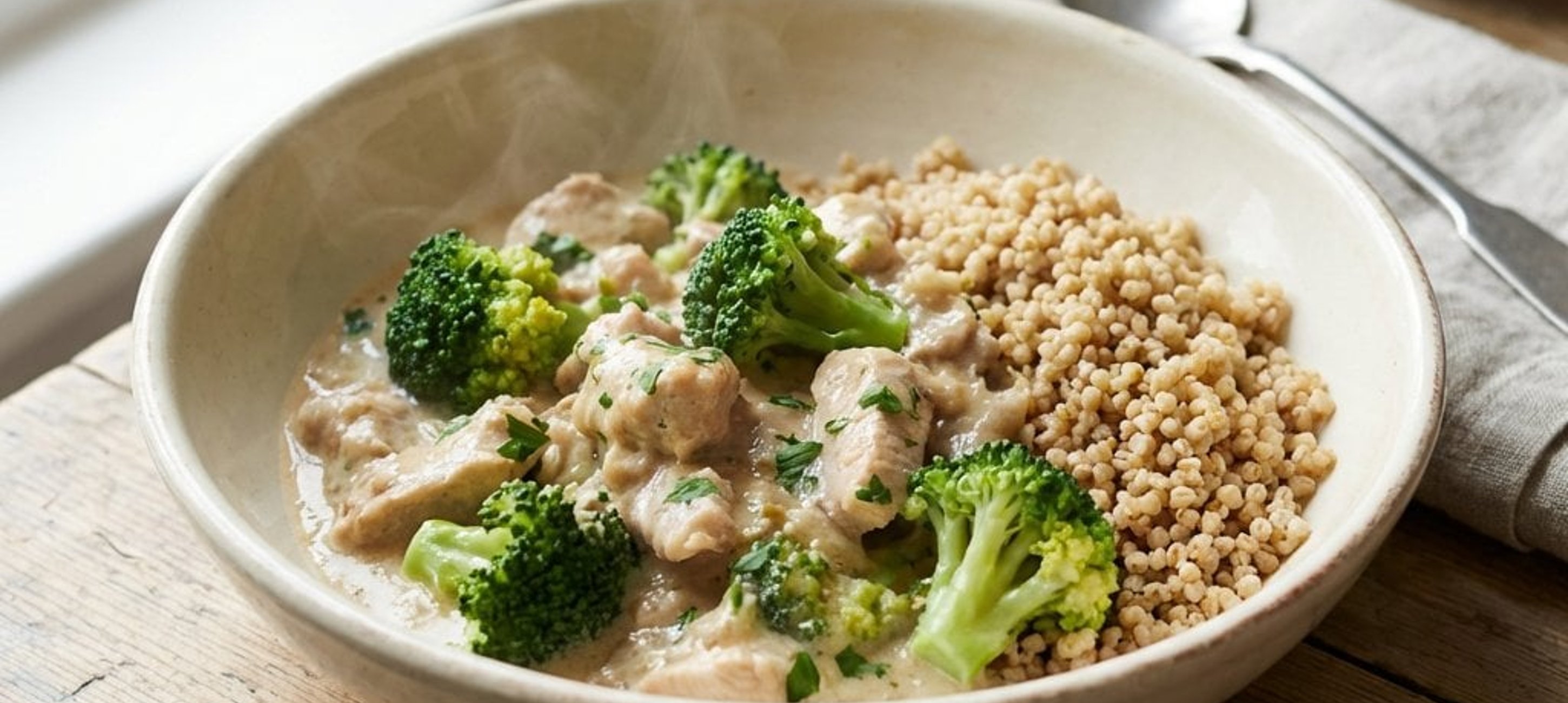 - 4Amíg a kuszkusz készül, készítsük el a pulykaragut. Egy serpenyőben hevítsünk fel 1 evőkanál olívaolajat, adjuk hozzá az aprított hagymát, és pirítsuk kb. 2 percig közepes lángon. Ezután adjuk hozzá a felcsíkozott pulykamellet, a sót, a borsot és a szárított kakukkfüvet, majd pirítsuk további 7 percig. A 6. percben adjuk hozzá a zúzott fokhagymát is, és pirítsuk még 1 percig, hogy az illata felszabaduljon. Végül öntsük fel a szójatejszínnel, adjuk hozzá a főtt brokkolit, és az egészet melegítsük össze még 3 percig.