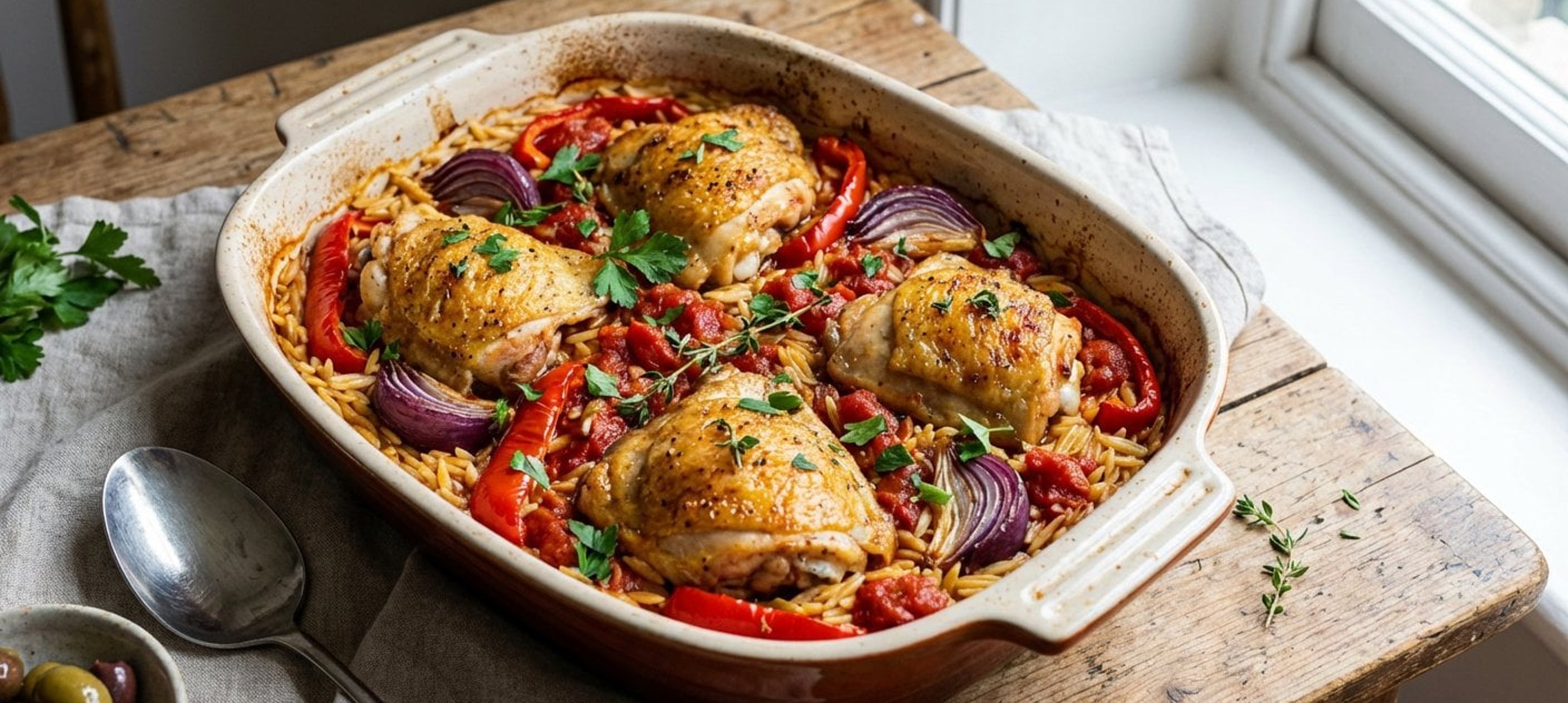 - 410 perc után sózzuk és borsozzuk a mártást, keverjük bele a száraz orzo tésztát, majd vegyük le a tűzről. Öntsük az egészet a tepsibe, rendezzük el a tetején az elősütött csirkecombokat. Tegyük a sütőbe, és süssük 20 percig 180 °C-on. Ezután emeljük a hőmérsékletet 220 °C-ra, és süssük további 10 percig, amíg a csirke bőre ropogós lesz.
