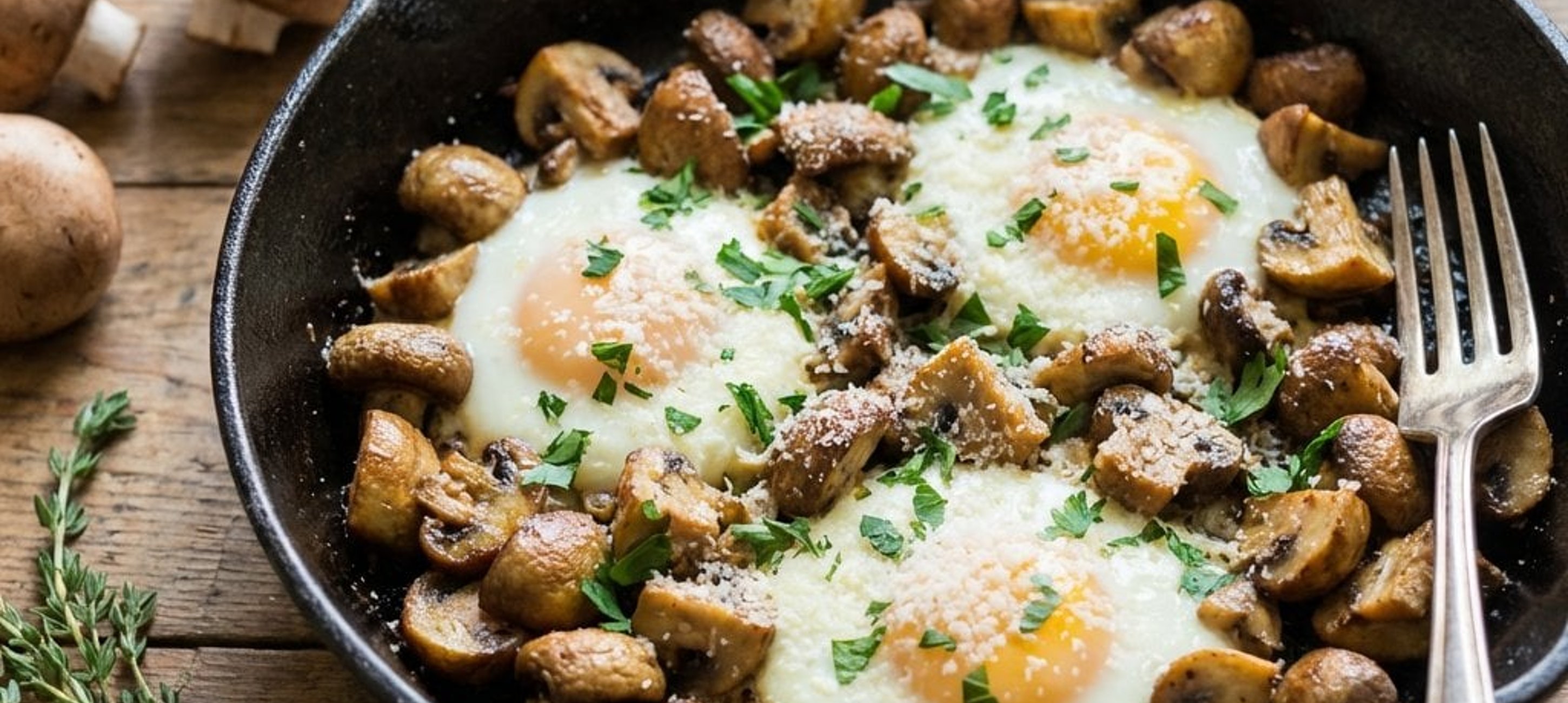 - 3Üssük a tojásokat a gombás keverékre, and szórjuk meg az egészet parmezánnal. Helyezzük a serpenyőt az előmelegített sütőbe, and süssük 4–5 percig 185–190 °C-on. Azonnal tálaljuk.