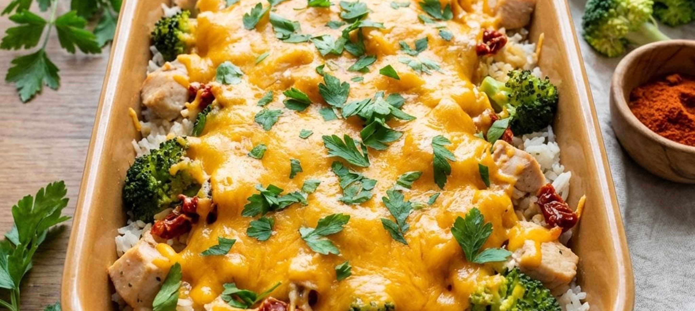 - 3Vegyük ki a tálat a sütőből, adjuk hozzá a főtt rizst és az aszalt paradicsomot, majd keverjük össze a hússal. A tetejére rendezzük el a brokkolirózsákat, és finoman nyomkodjuk bele a rizsbe. Szórjuk meg a reszelt cheddar sajttal, majd süssük tovább 180 °C-on 15–20 percig, amíg a sajt szépen ráolvad és aranybarna lesz.