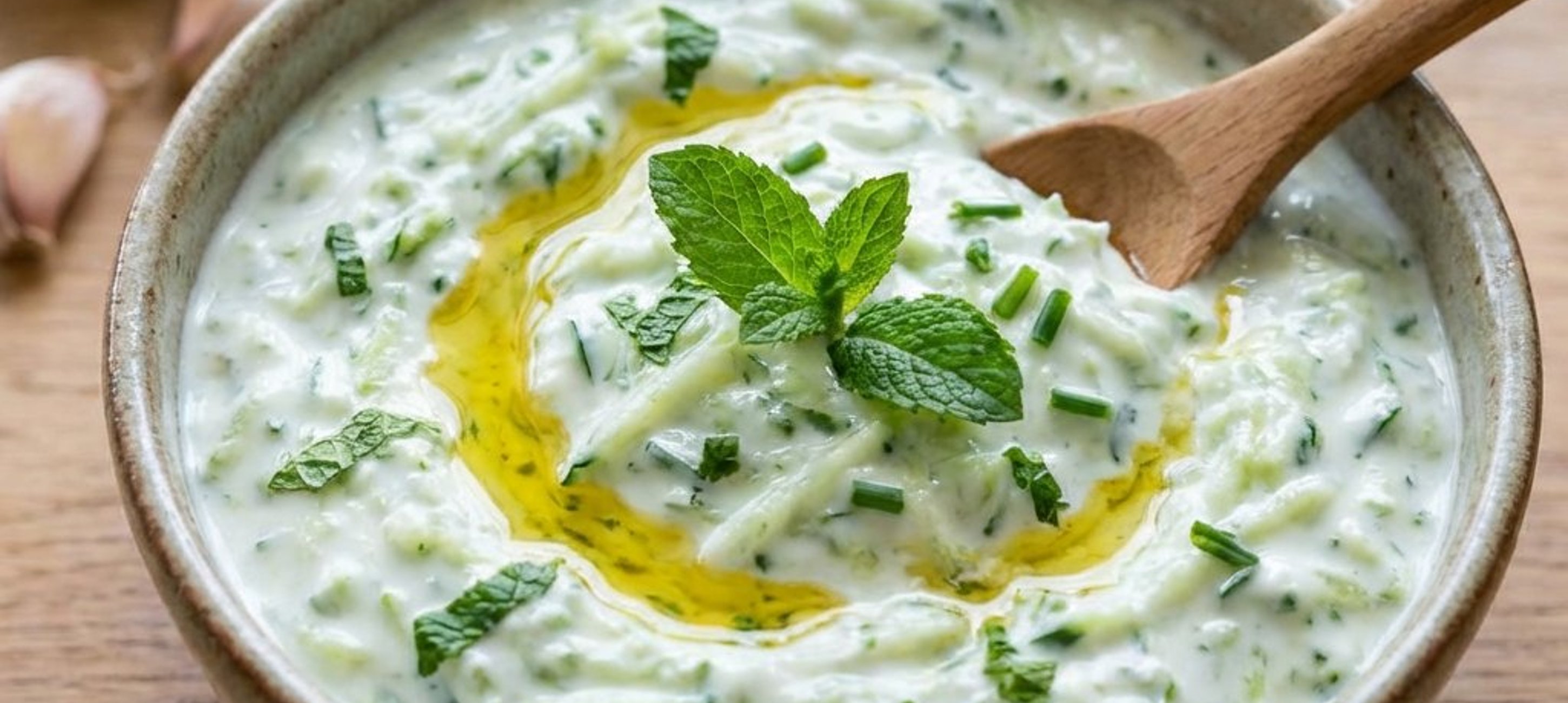 - 2Egy tálban keverjük össze a görög joghurtot az olívaolajjal, a citromlével, a zúzott fokhagymával, valamint a finomra vágott mentával and snidlinggel. Ízlés szerint sózzuk és borsozzuk.