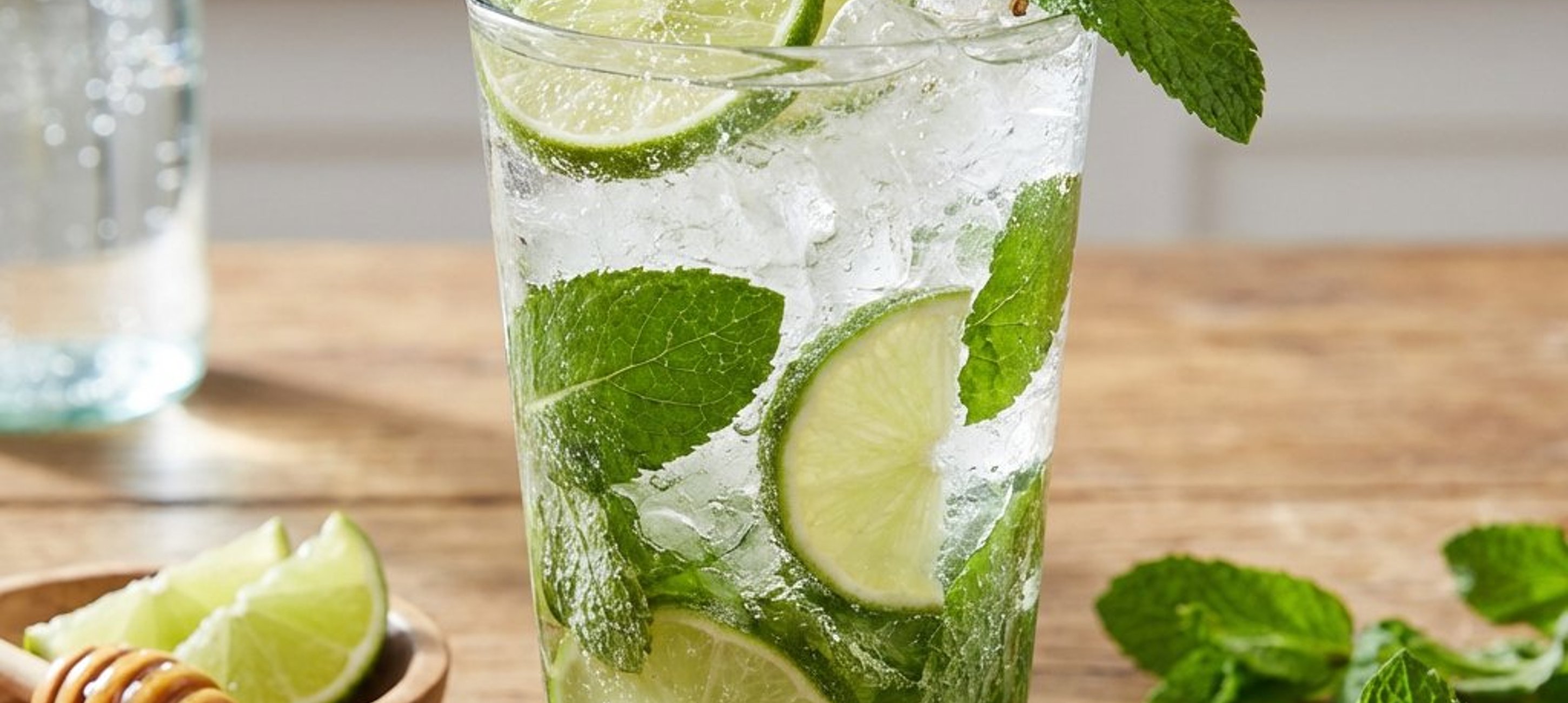 - 1Egy magas szervírozópohárba tegyük bele a lime levet, a mézet, a lime-szeletek felét és a mentaleveleket, majd egy törőfa segítségével alaposan nyomkodjuk össze őket, hogy az ízek felszabaduljanak.