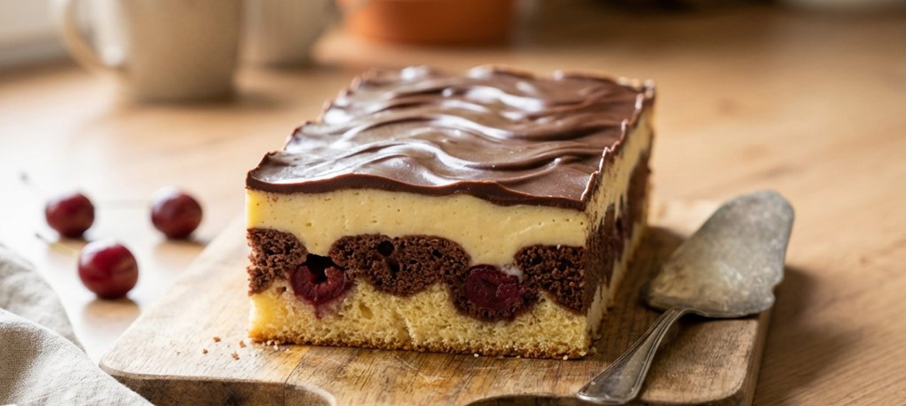 - 3A maradék tésztához keverjünk hozzá a kakaópor és 1 evőkanál tejet, majd simítsuk a világos tészta tetejére. Szórjuk rá a lecsöpögtetett meggyet, és enyhén nyomkodjuk bele. Süssük kb. 25-30 percig, majd hagyjuk teljesen kihűlni.