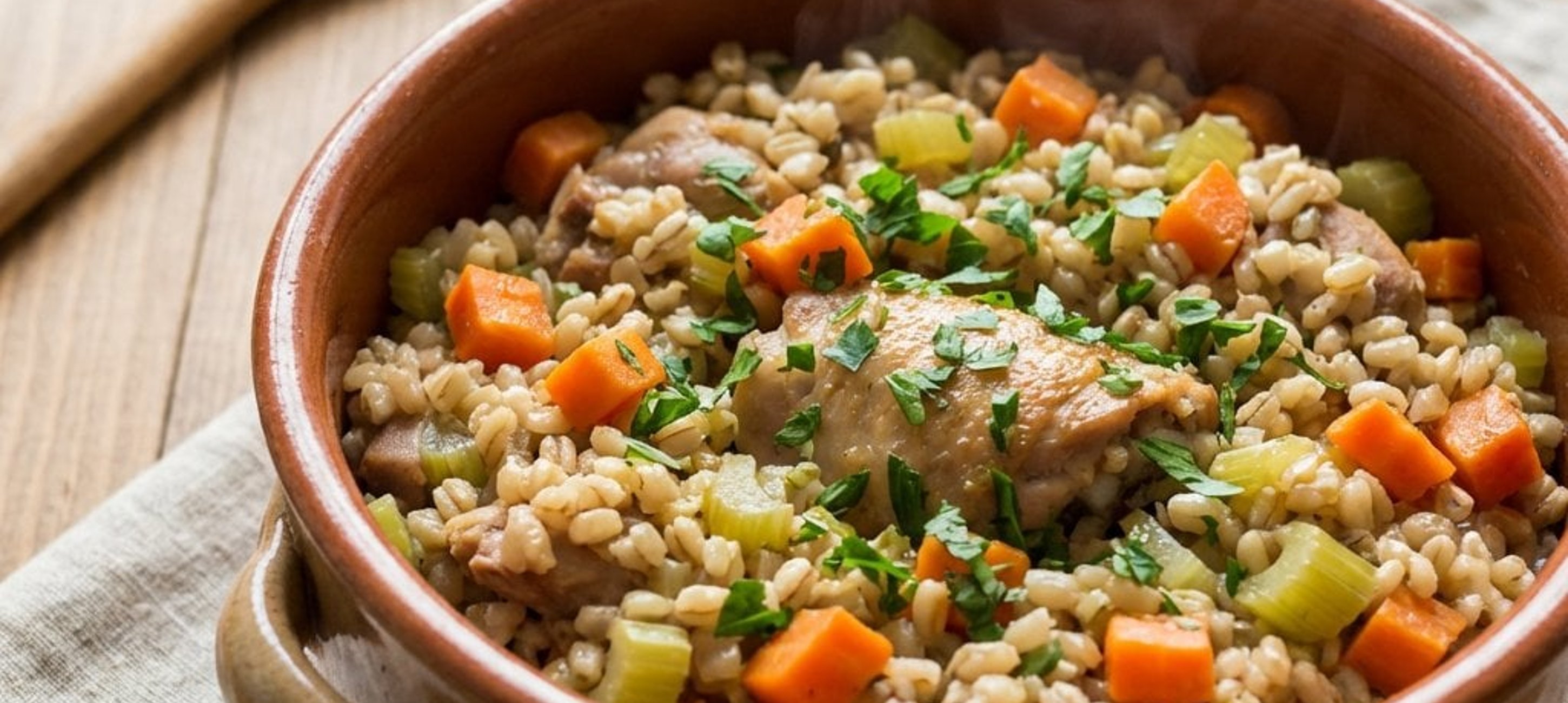 - 5Fedjük le az edényt fedővel (vagy alufóliával), tegyük a sütőbe, és süssük 160–170 °C-on 40–50 percig, amíg az árpa és a hús is megpuhul.