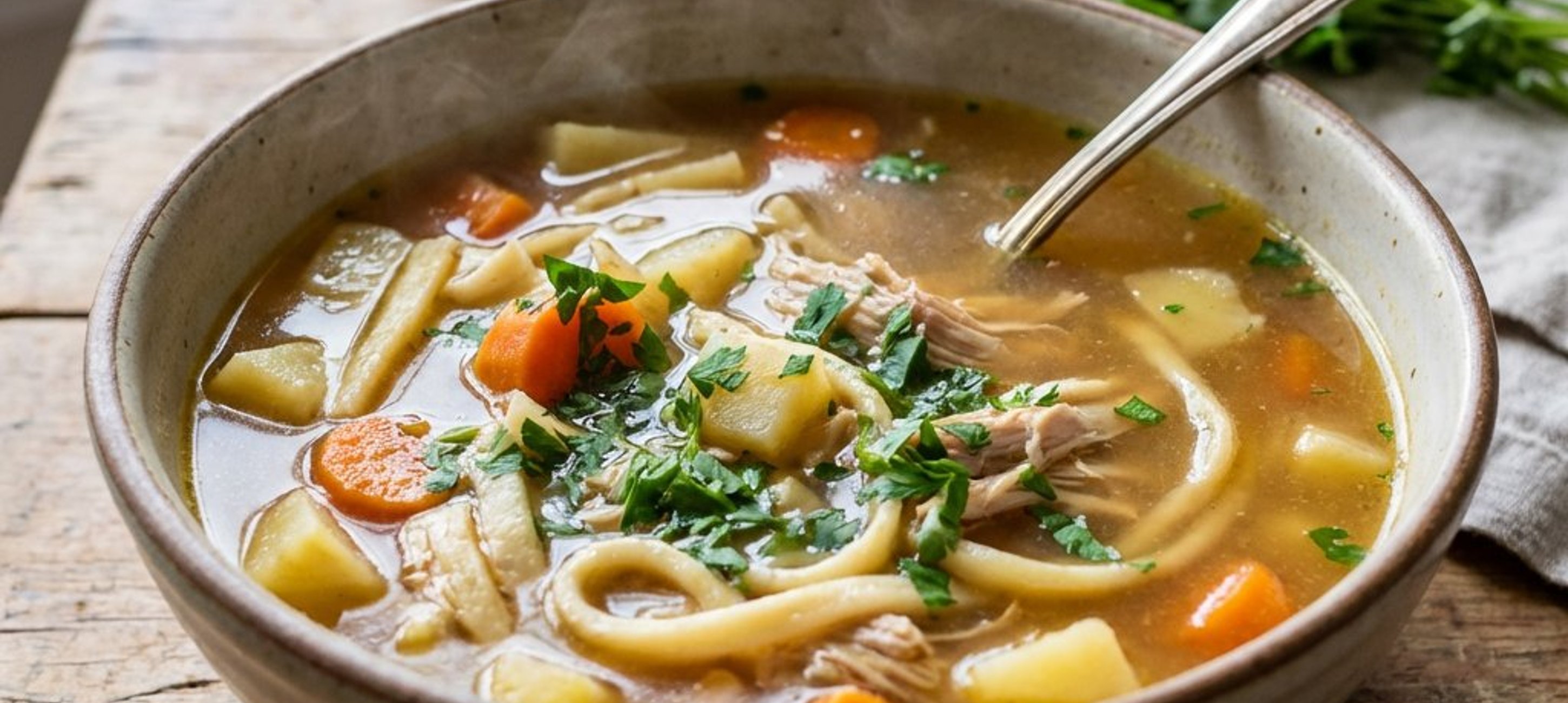 - 3Tálaláskor tegyünk a tányérokba a húsból, a zöldségekből és a tésztából, majd merjük rá a forró levest. Szórjuk meg bőségesen frissen vágott petrezselyemzölddel.