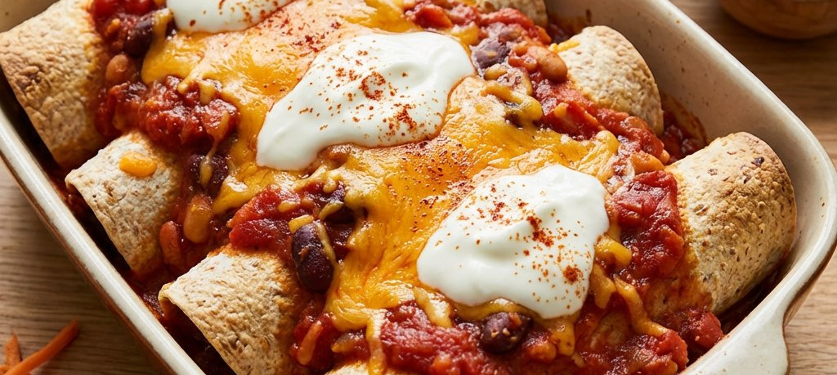 - 4A natúr joghurtot keverd össze a reszelt cheddar sajttal és egy kevés chilivel, majd egyenletesen oszasd el az enchiladák tetején. Tedd a 250°C-ra előmelegített sütőbe néhány percre, amíg a sajt ráolvad és aranybarnán buborékolni kezd. Tálald extra enchilada szósszal.