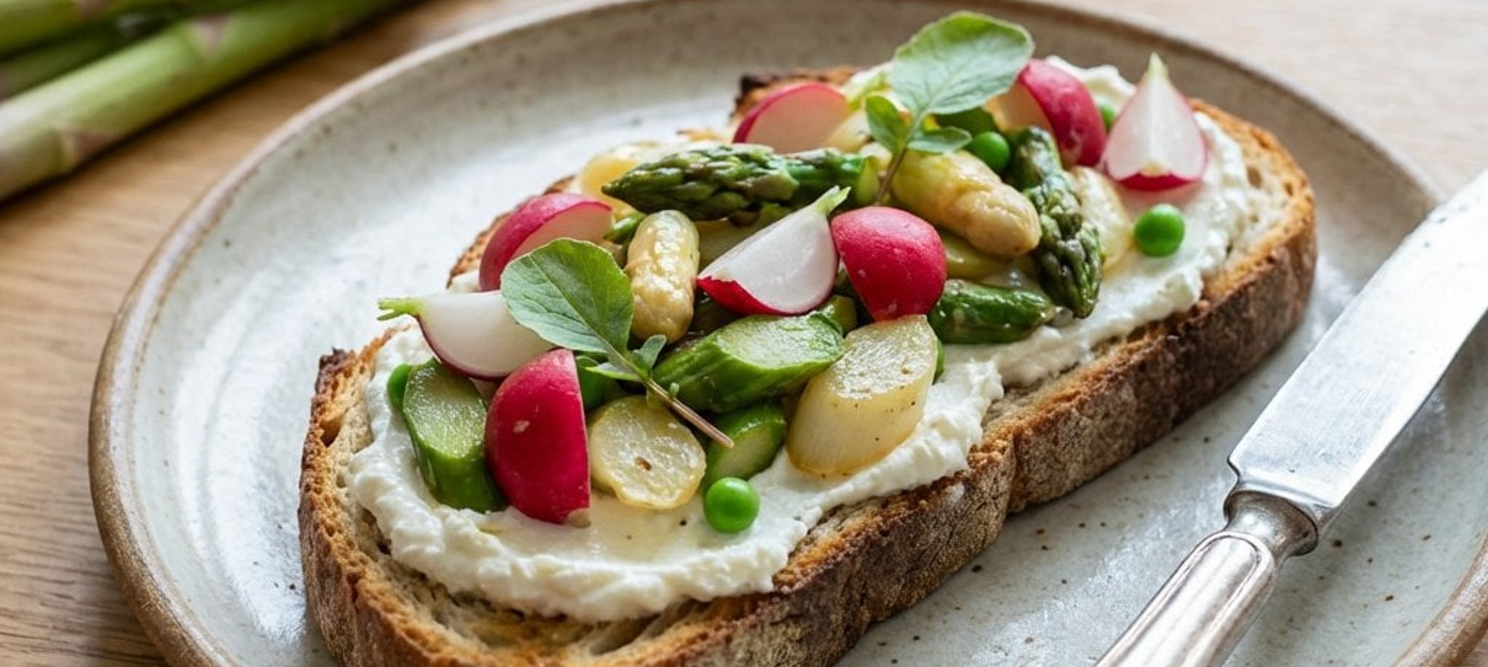 - 4A pirítóst kenjük meg bőségesen krémsajttal, majd halmozzuk rá a sült spárgás keveréket. Díszíthetjük apró reteklevéllel és frissen kifejtett borsóval. Forrón tálaljuk.
