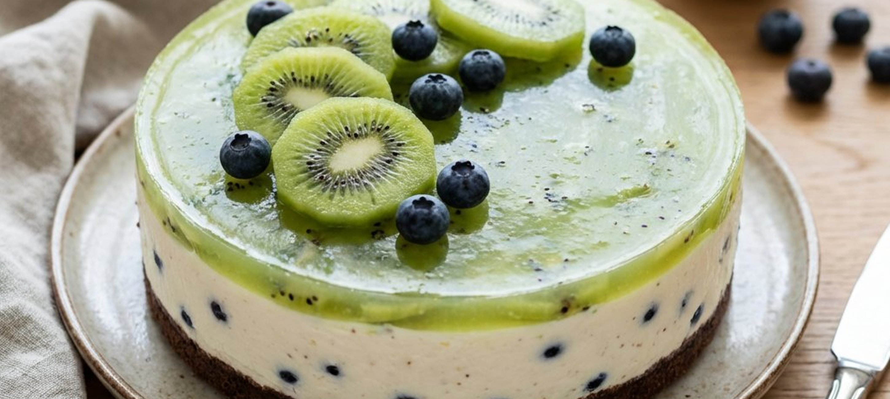 - 3Öntsük a kiwi zselét a már megdermedt túrókrém tetejére, és tegyük vissza a hűtőbe néhány órára. Tálalás előtt éles késsel vágjuk körbe a formát, és díszítsük friss kiwi szeletekkel, lime-mal vagy áfonyával.