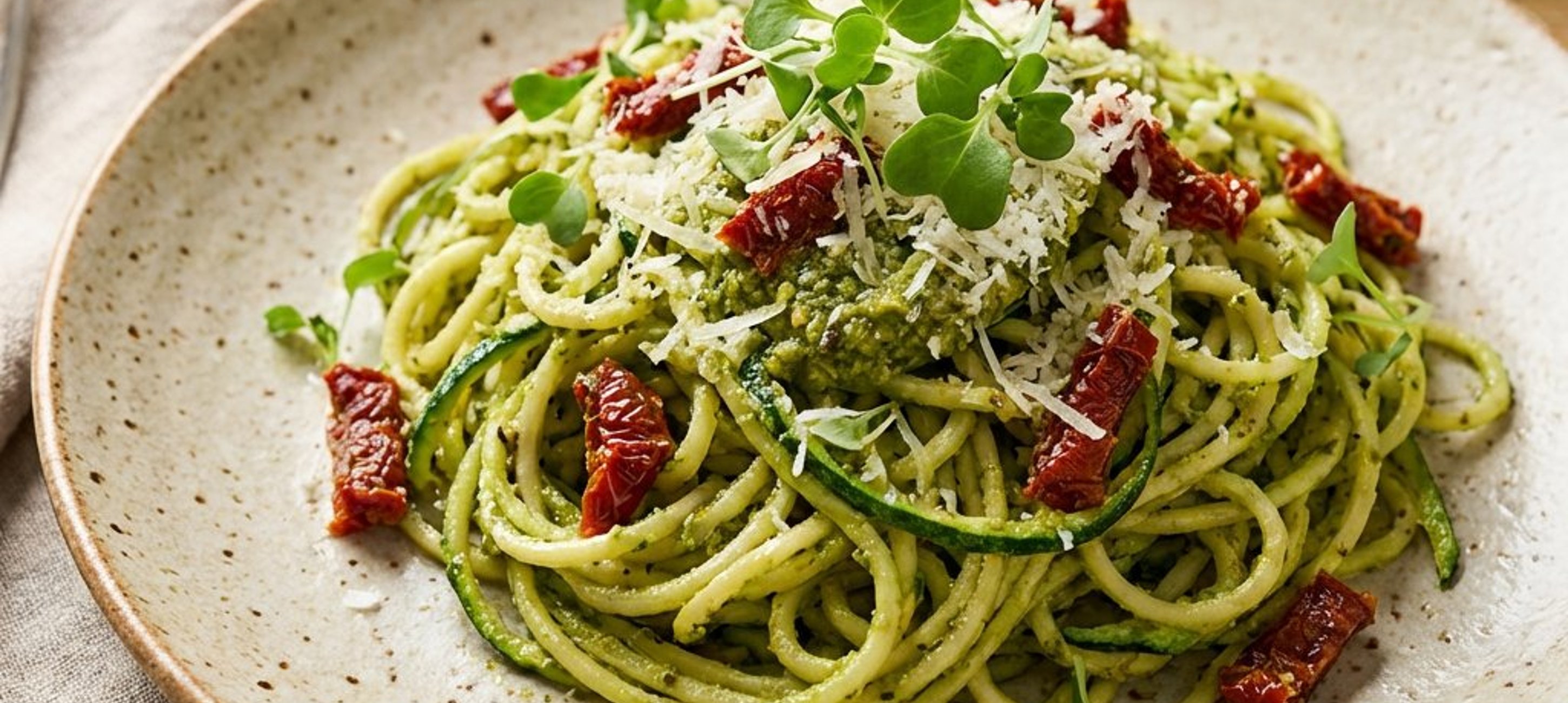 - 4Óvatosan forgassuk bele a pestót és a darabolt aszalt paradicsomot, majd borsozzuk meg. Tálaláskor szórjuk meg a maradék reszelt parmezánnal és a friss csírákkal.