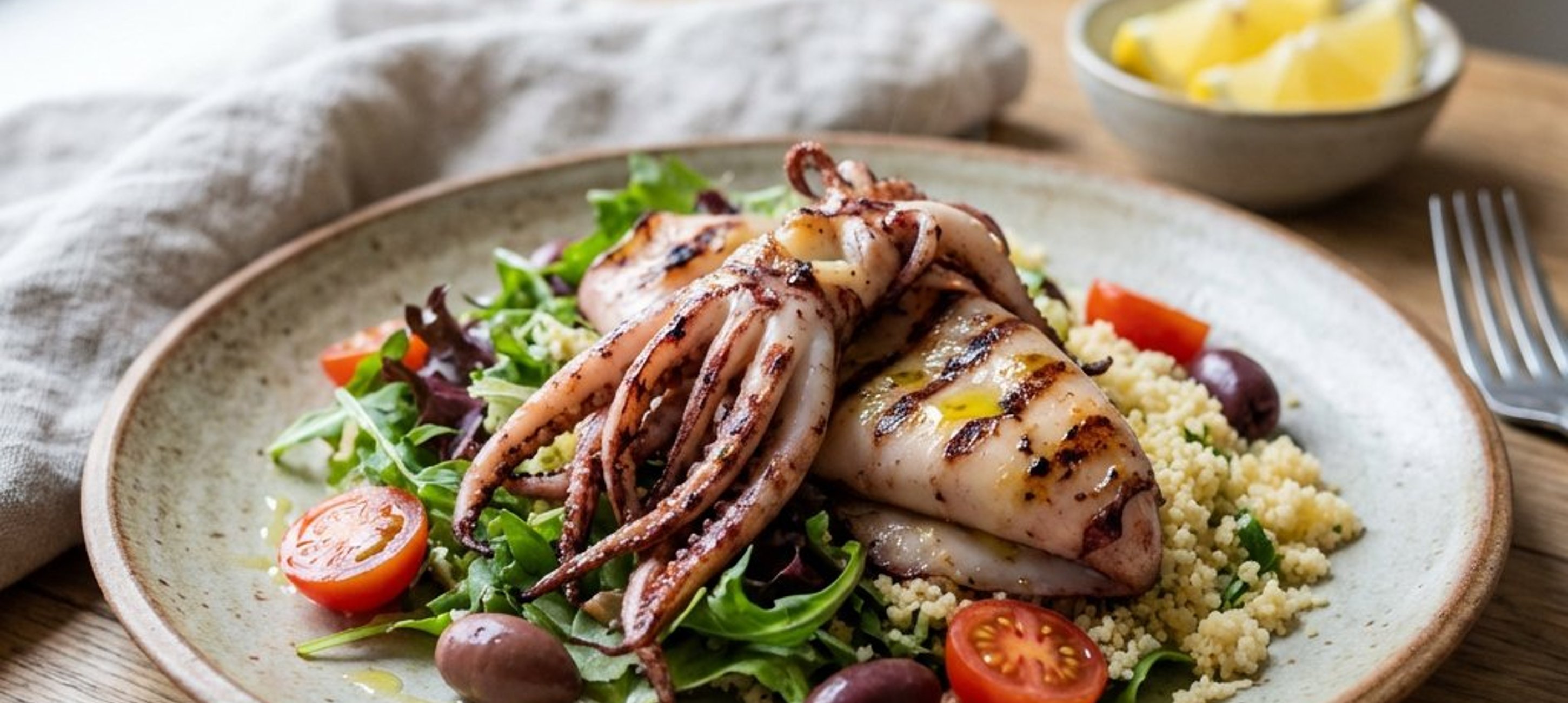 - 6Tálaláskor halmozzuk a tányérra a kuszkuszt, a vegyes salátát, majd helyezzük rá a tintahalas zöldségeket. Locsoljuk meg citromlével és olívaolajjal, végül szórjuk meg petrezselyemmel.