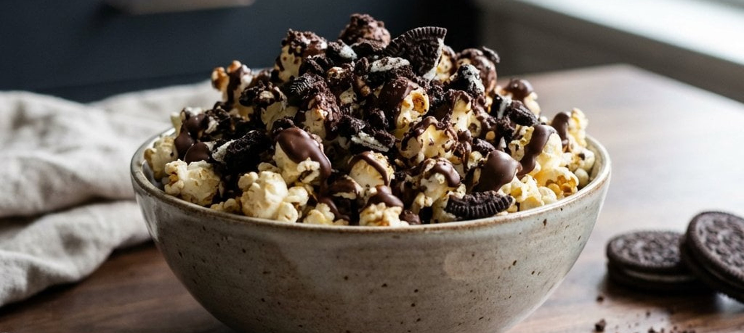 - 6A sütés után hagyjuk a popcornt teljesen kihűlni a tepsiben, így lesz igazán ropogós. Tálalás előtt szórjuk rá a félretett darabolt Oreo kekszeket, and osszuk kisebb tálkákba.