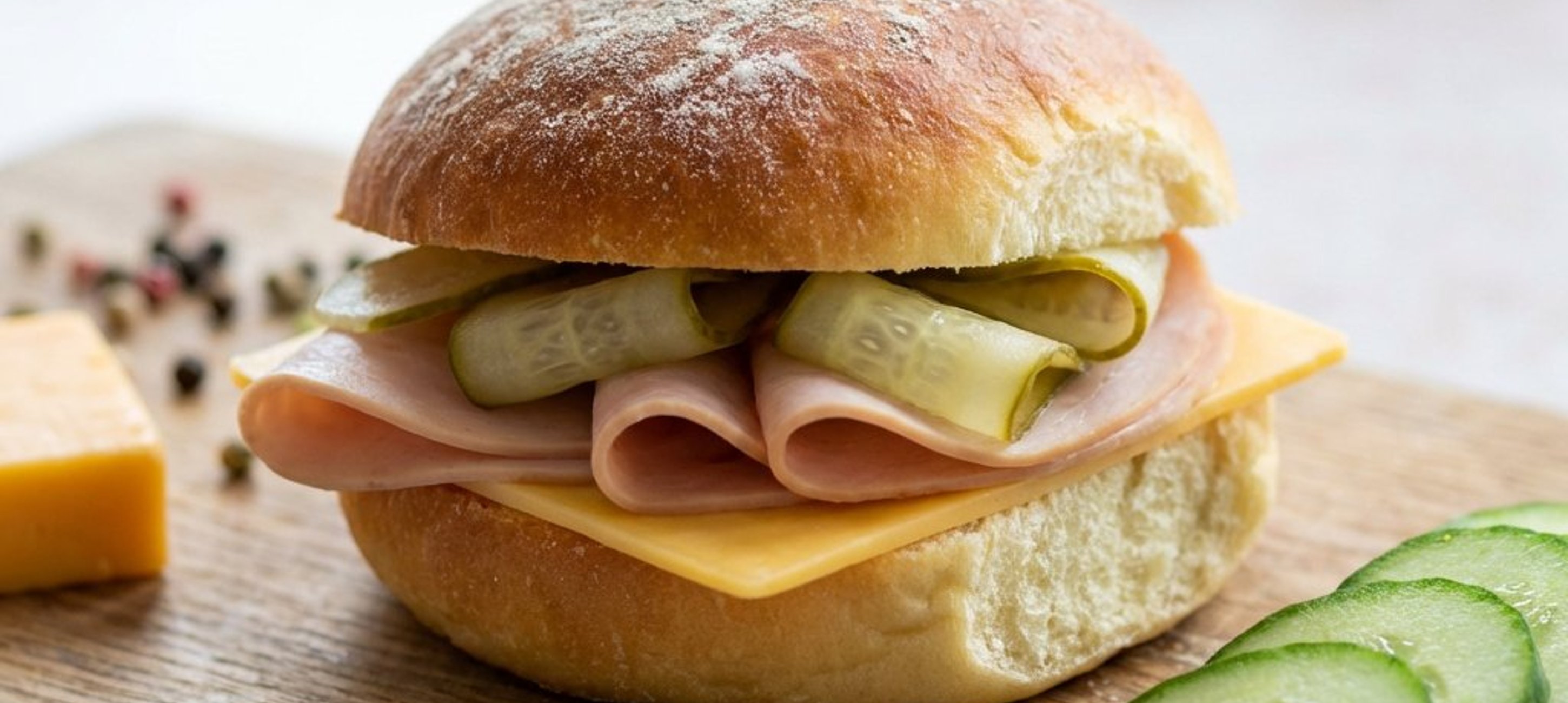 - 2A zsemléket vágjuk félbe, kenjük meg a maradék vajjal. Töltsük meg pulykasonkával, cheddar sajttal és a savanyított uborkával.
