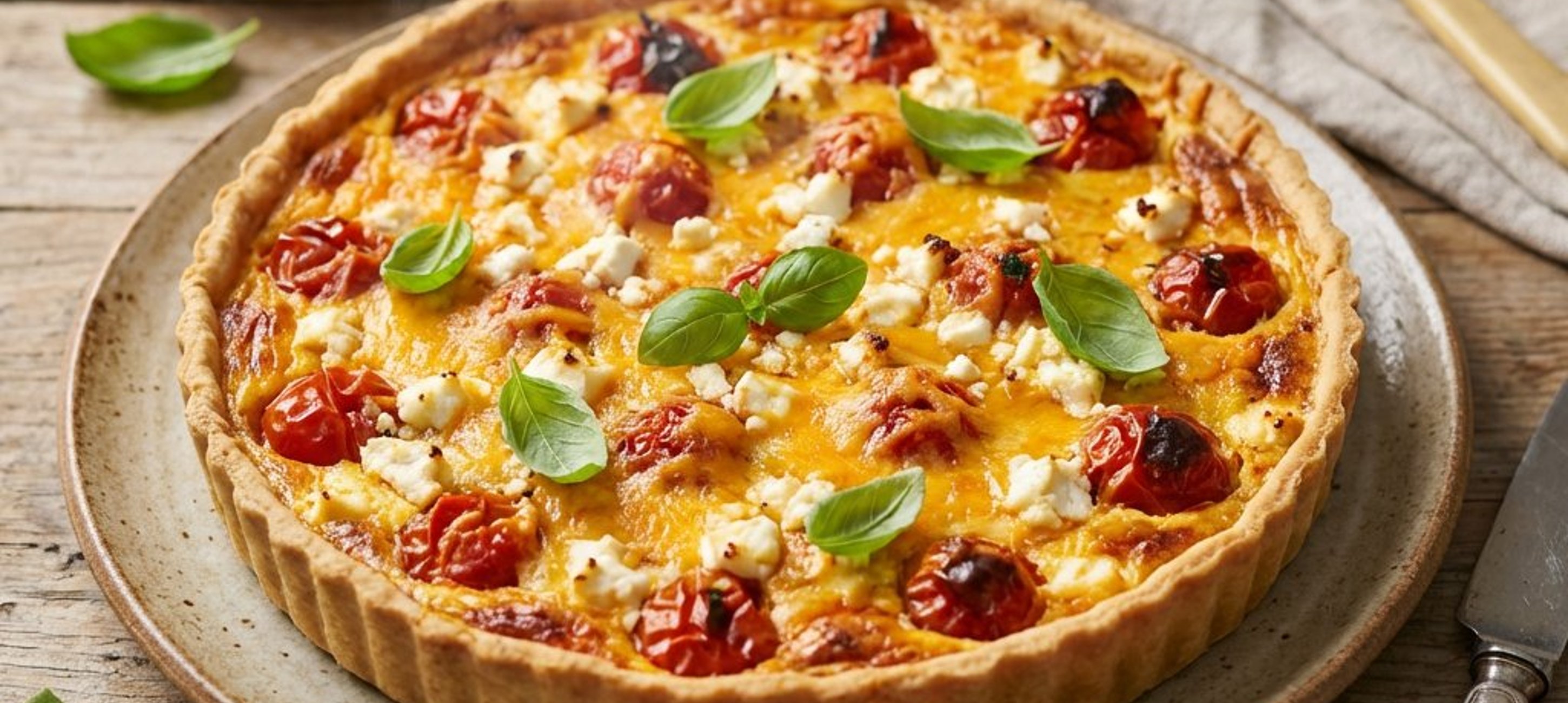 - 7A kisült pite tetejére morzsoljuk rá a feta sajtot, és díszítsük friss bazsalikomlevelekkel.