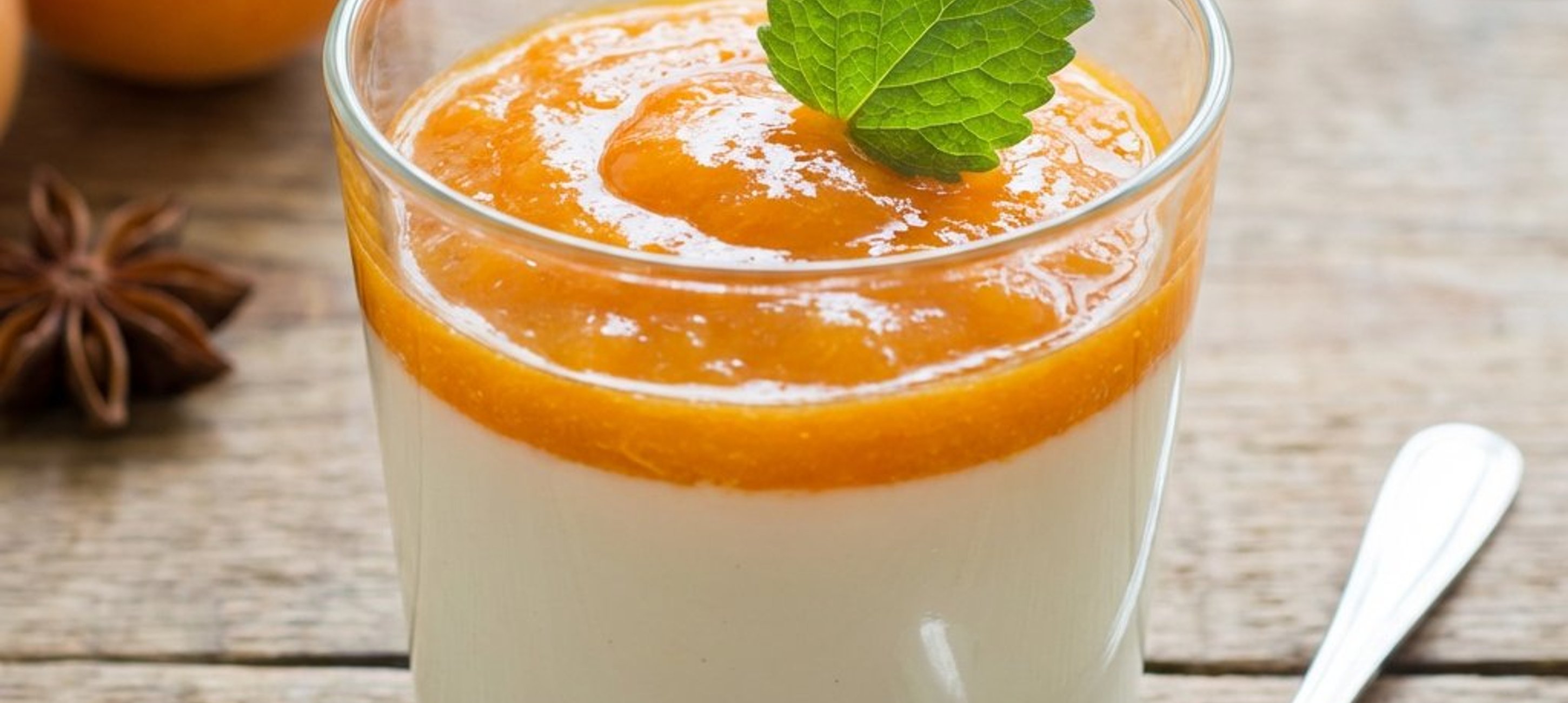 - 7A sárgabarackmártást öntse a már kihűlt Panna Cotta tetejére, and díszítse friss citromfűvel.