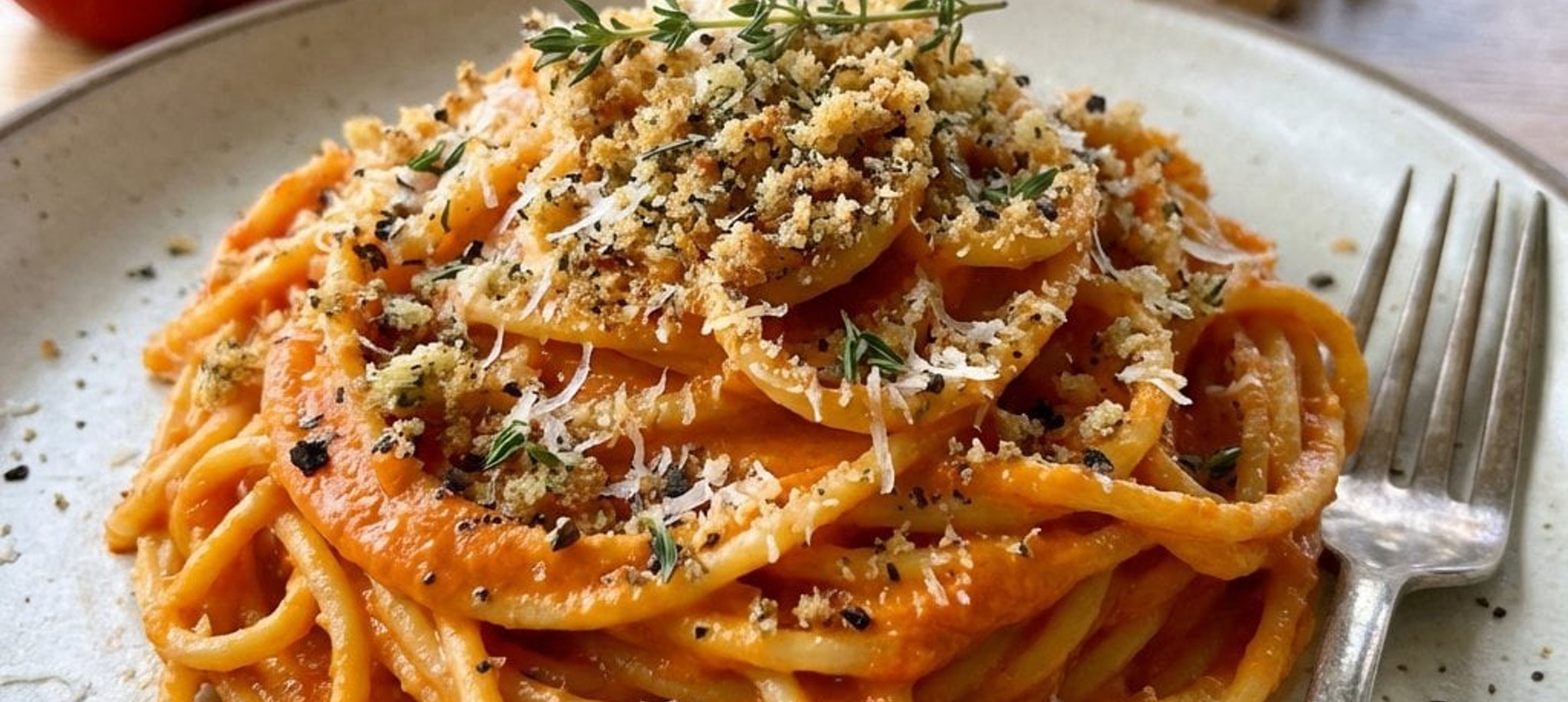 - 2A kész tésztát tálaljuk a sajtos morzsával, friss fűszernövényekkel és extra fekete borssal megszórva.
