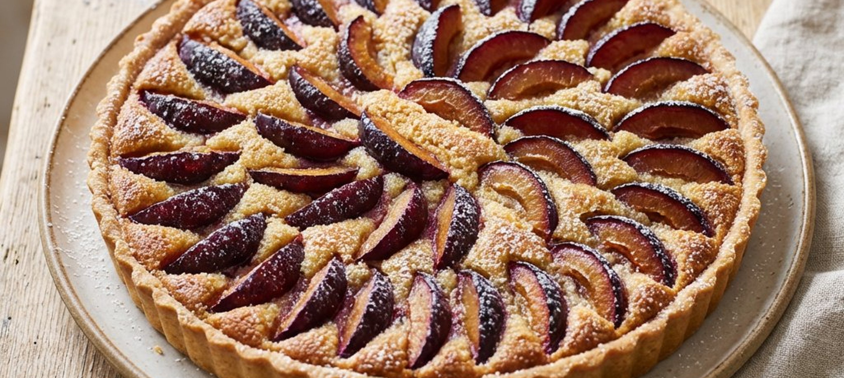 - 3A hűtött tésztára simítsuk rá a frangipane krémet. A szeletekre vágott szilvát rendezzük el a tetején tetszés szerint. Szórjuk meg kevés porcukorral.