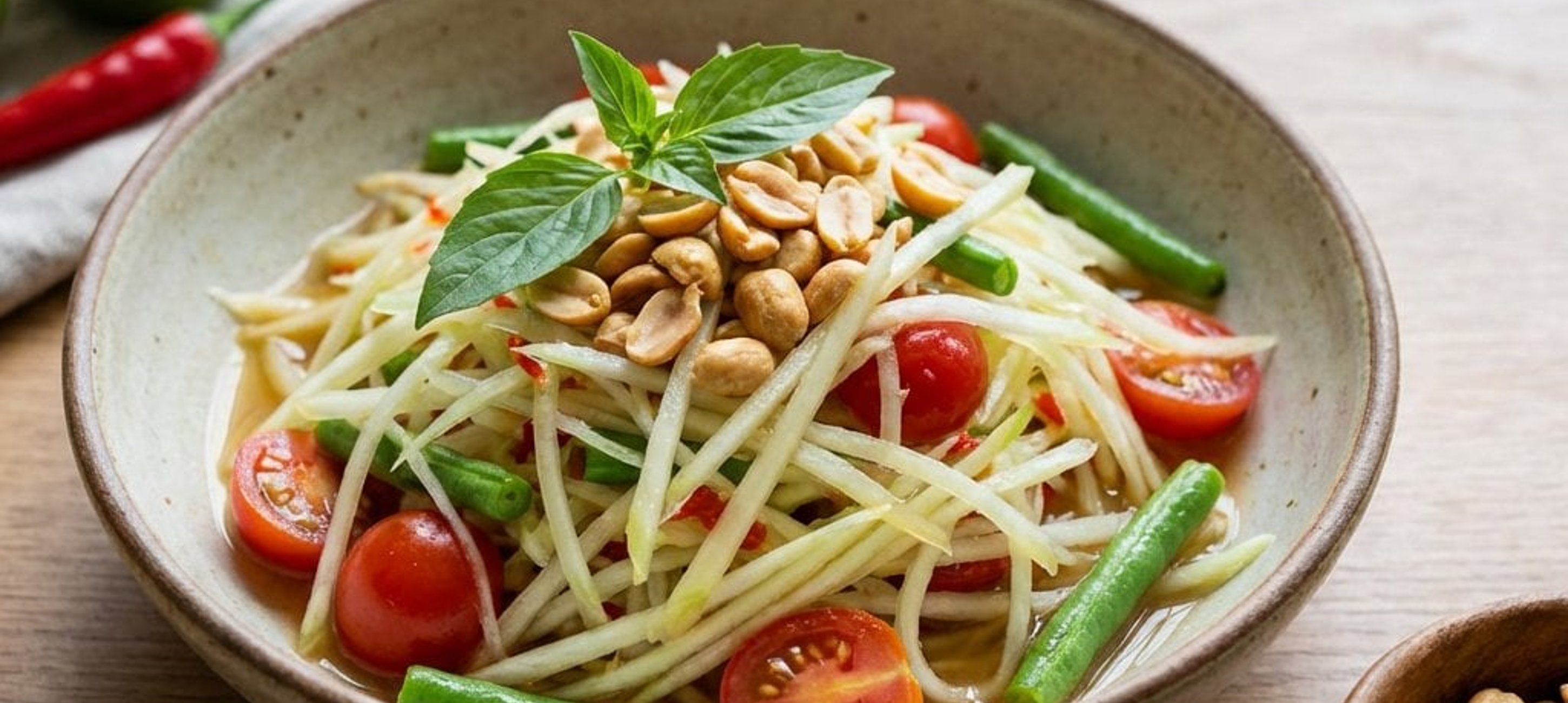 Ha nem találsz zöld papayát, helyettesítheted kemény, éretlen mangóval vagy akár sárgarépa és jégcsapretek keverékével is a hasonló textúra érdekében.