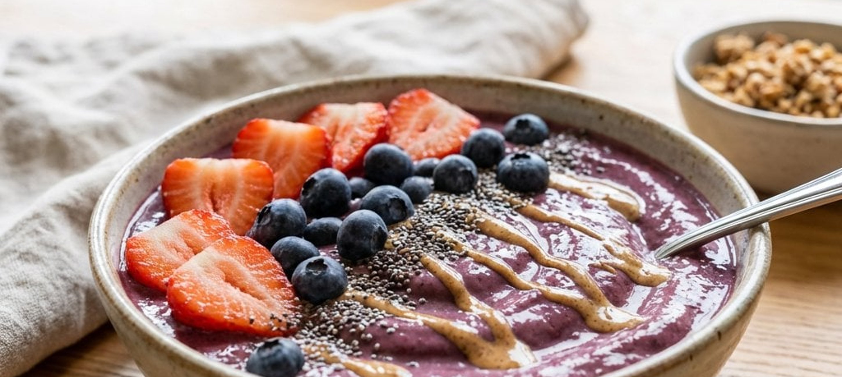 - 3Öntsük a keveréket két tálba, majd díszítsük a tetejét friss áfonyával, eperrel, chia maggal és egy kevés mandulavajjal. Azonnal tálaljuk!