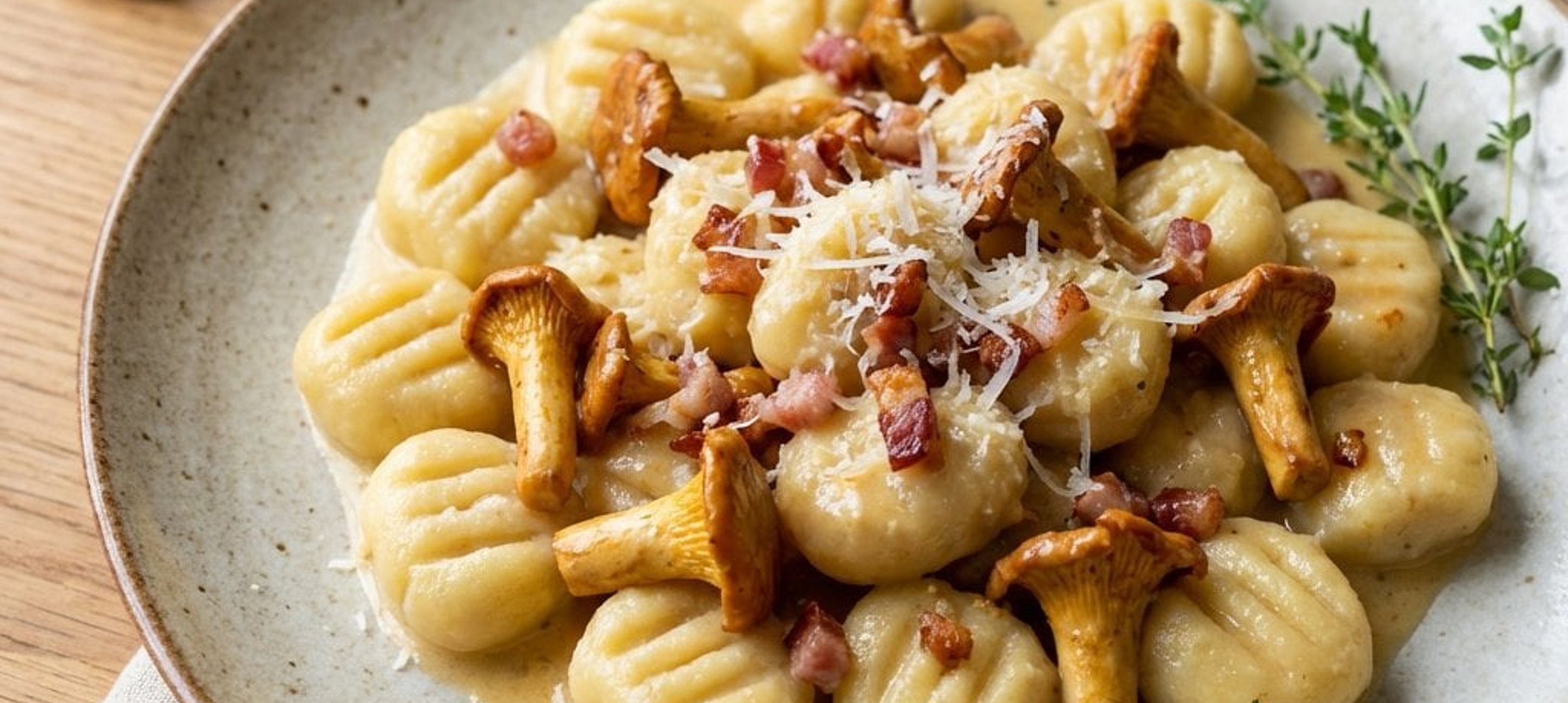 - 2Amíg a burgonya fő, készítsük el a mártást. Egy serpenyőben hevítsünk olívaolajat, és pirítsuk meg rajta az apróra vágott vöröshagymát. Adjuk hozzá a szeletelt fokhagymát, és hagyjuk aranybarnára pirulni. A rókagombát vágjuk kisebb darabokra (a kisebbeket hagyjuk egészben), tegyük a serpenyőbe a kakukkfűágakkal együtt, majd öntsük fel a proseccóval. Sózzuk meg egy csipet sóval, és pároljuk kb. 5 percig, amíg a gomba megpuhul. Vegyük lejjebb a lángot, öntsük hozzá a tejszínt, és hagyjuk a felére sűrűsödni. Ízesítsük borssal, és keverjük bele a finomra vágott pecorino sajt felét.