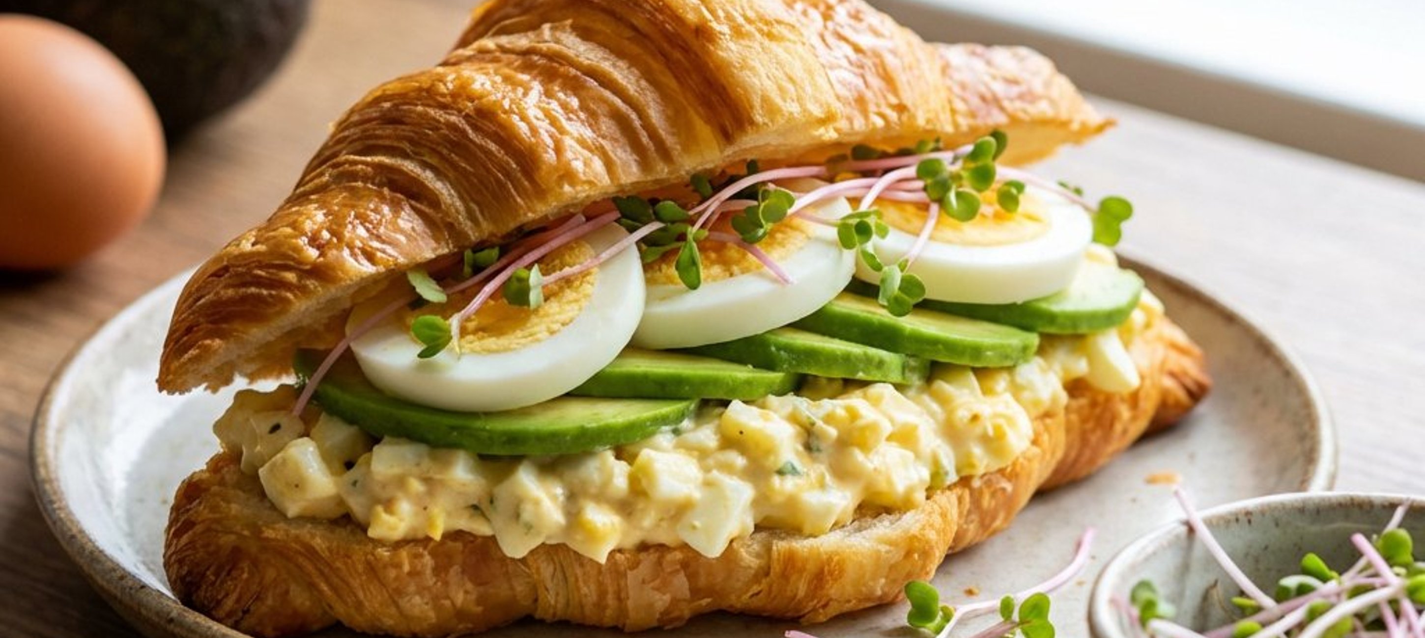 - 2Szeleteld fel az avokádót és a keményre főzött tojást, majd rétegezd őket a croissant alsó felére.