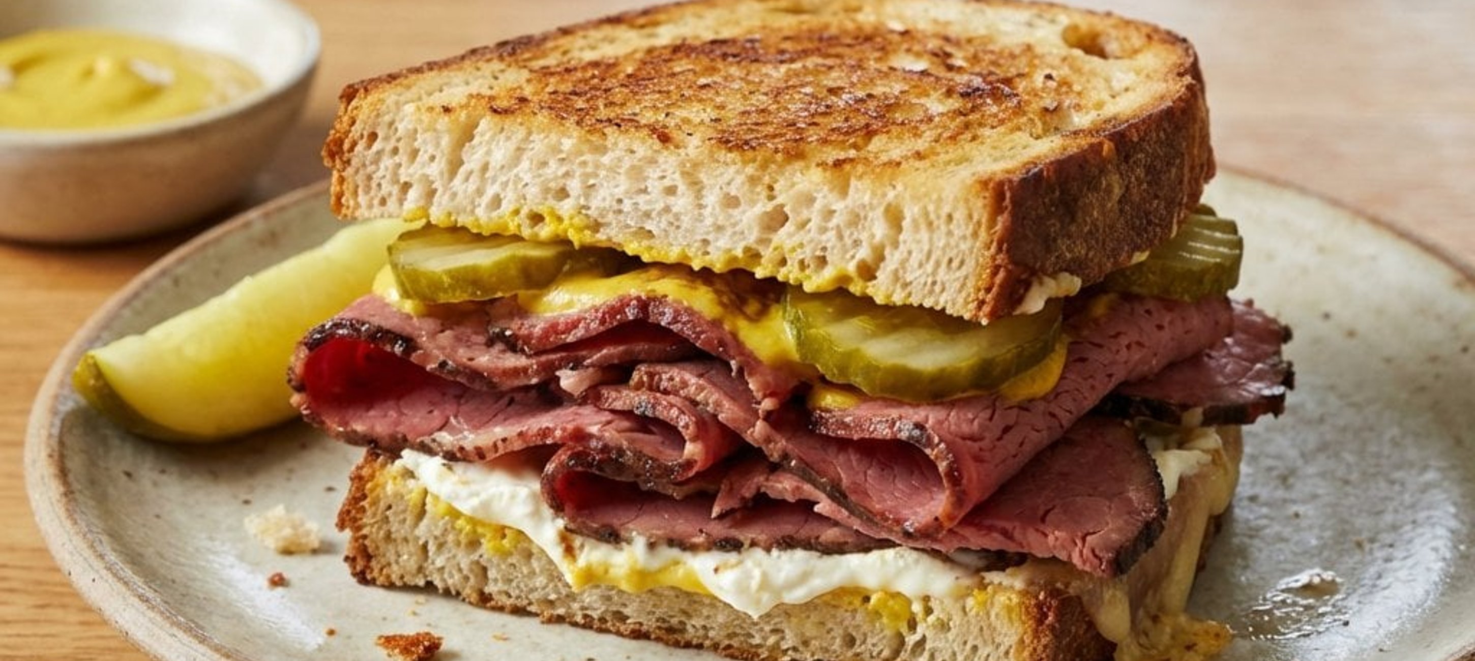 - 2Helyezz rájuk egy nagy adag szeletelt pastrami marhahúst, majd fektesd a tetejére a vékonyra szeletelt csemegeuborkákat. Borítsd össze a szendvicset, és már tálalhatod is!