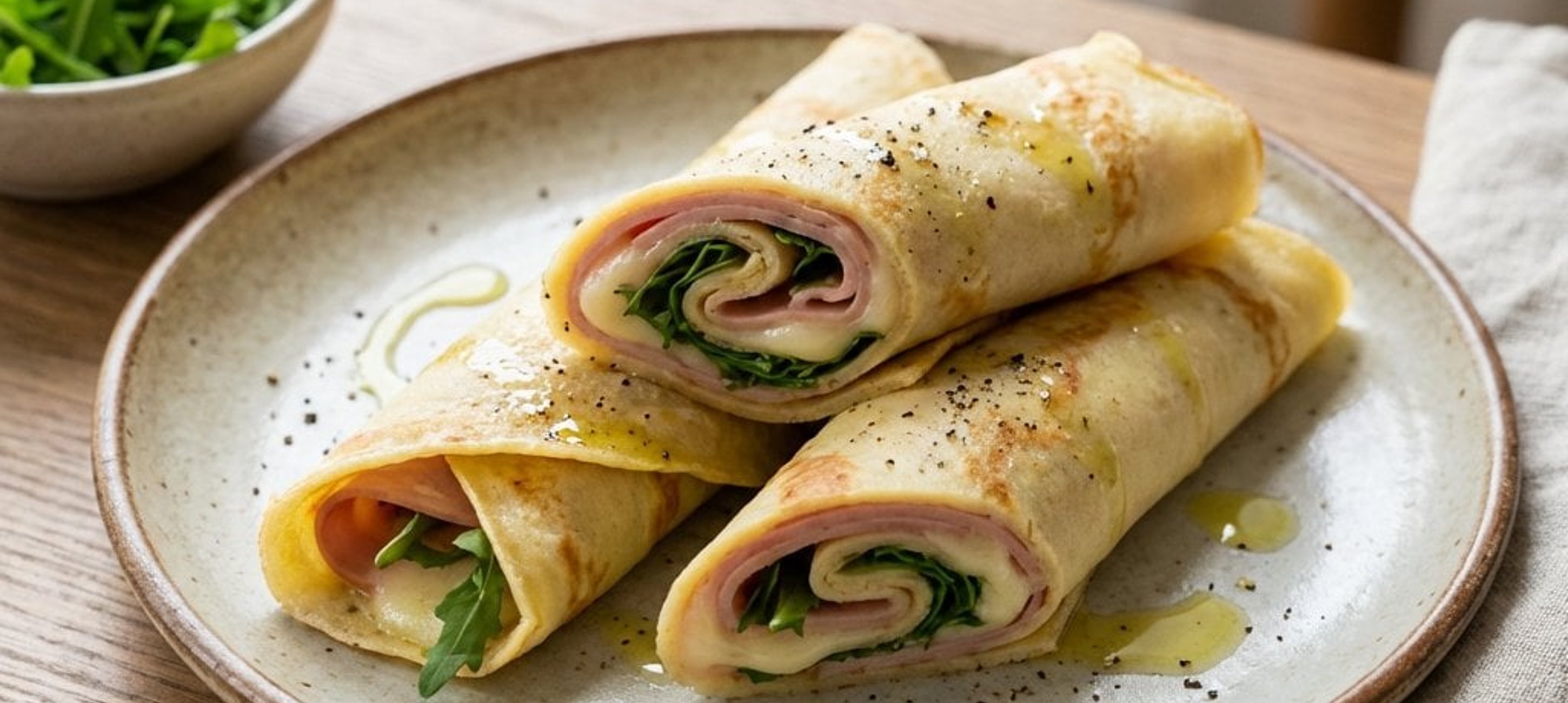 - 1A kihűlt palacsintára helyezze rá a sajtot (ne teljesen a széléig), majd tegye rá a mortadellát, végül a paradicsomot, a rukkolát vagy egy kevés friss krémsajtot. A kombinációk ízlés szerint variálhatók. Fontos, hogy a sajt kerüljön alulra, hogy sütéskor "lezárja" a palacsintát.