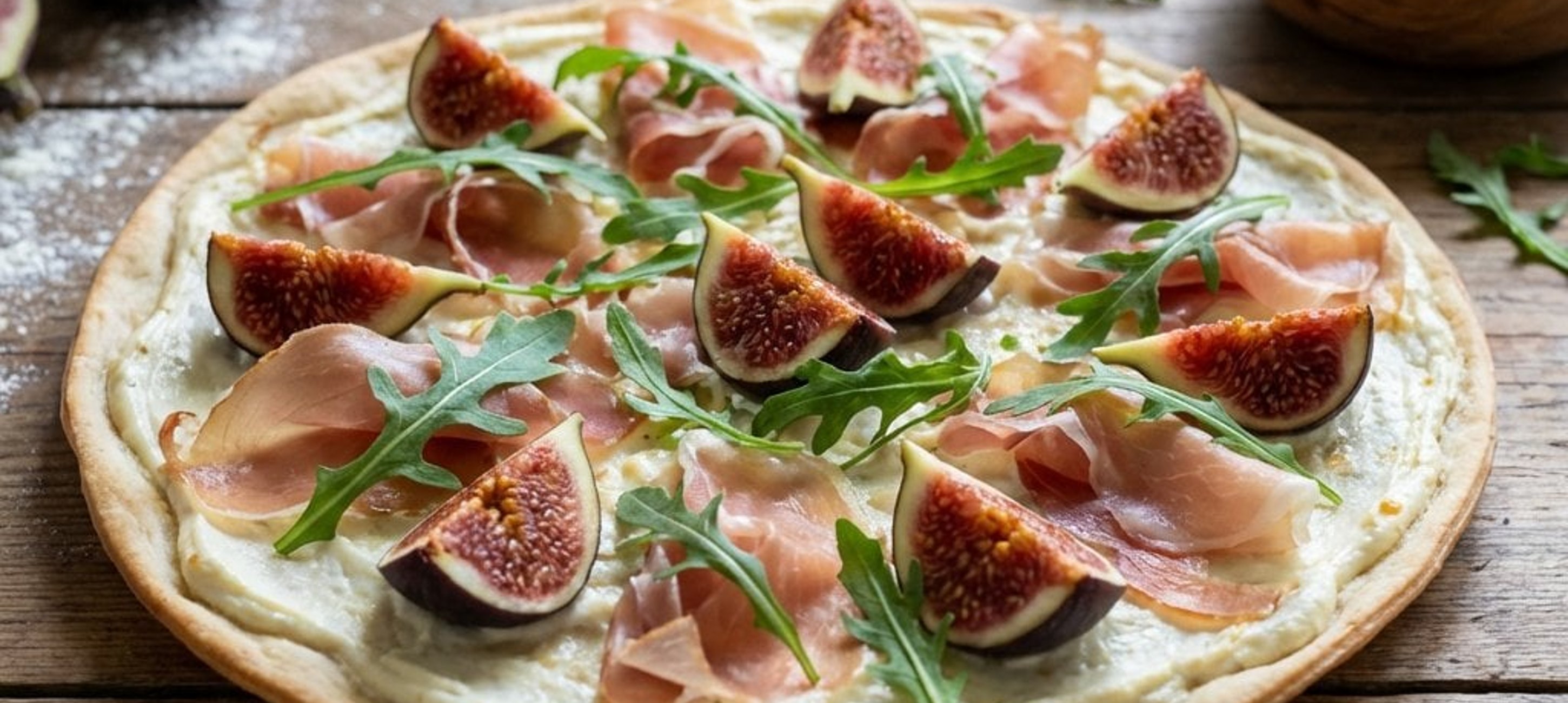 - 4Osszuk a tésztát két részre, és nyújtsuk ki nagyon vékonyra egy kevés liszt segítségével, majd helyezzük sütőpapírra. Kenjük meg a tejfölös-sajtos krémmel, és rakjuk rá a sonkát és a fügét.
