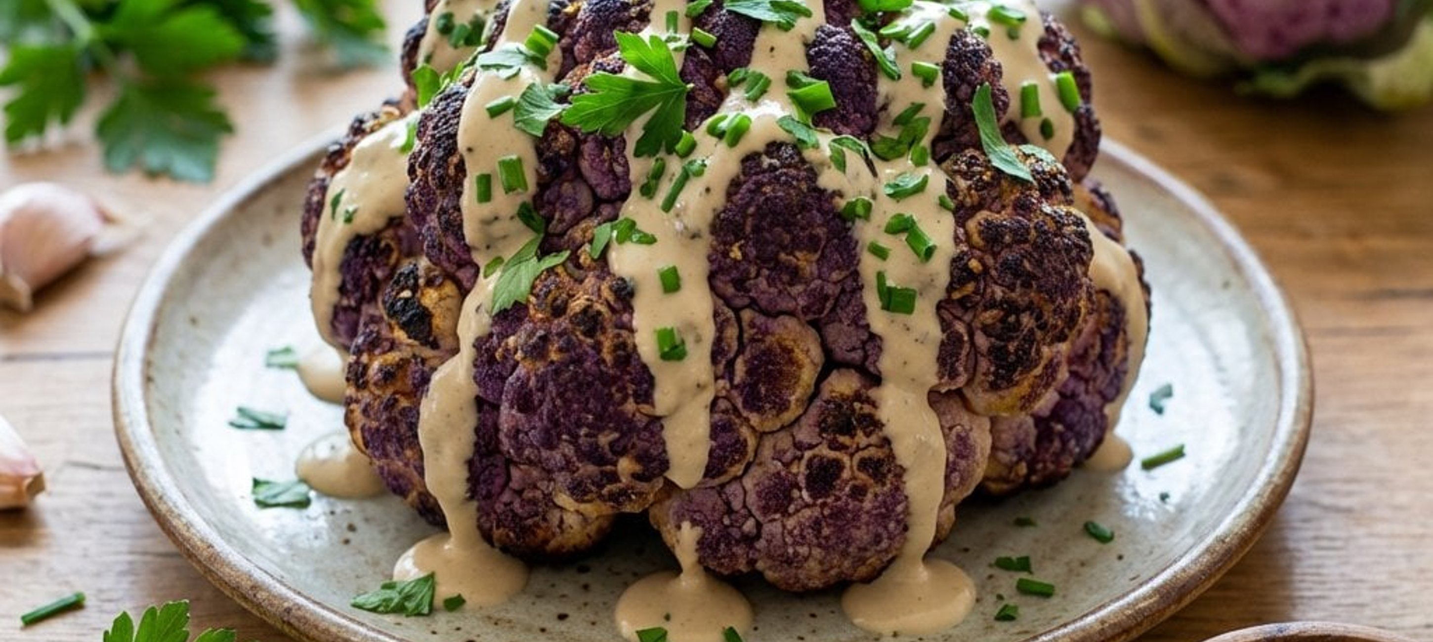 - 4A megsült karfiolt tálaláskor szórjuk meg friss petrezselyemmel és metélőhagymával, majd locsoljuk meg a krémes tahini öntettel.