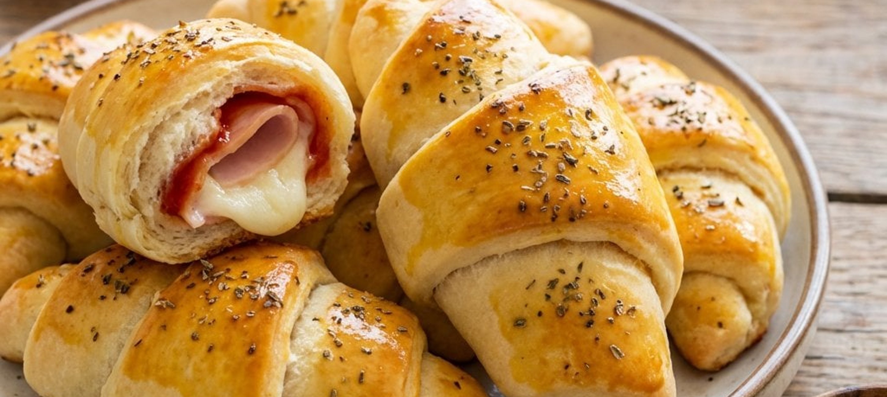 - 3A tésztát ossza 4 részre. Minden részből nyújtson egy téglalapot, és vágja fel 3 háromszögre. A háromszögeket kenje meg ketchuppal, tegyen rájuk sajtot és sonkát, majd a szélesebb oldaluktól indulva tekerje fel őket. A kifliket a csúcsukkal lefelé helyezze a tepsire, hogy sütés közben ne nyíljanak szét. Ismételje meg a maradék tésztával.