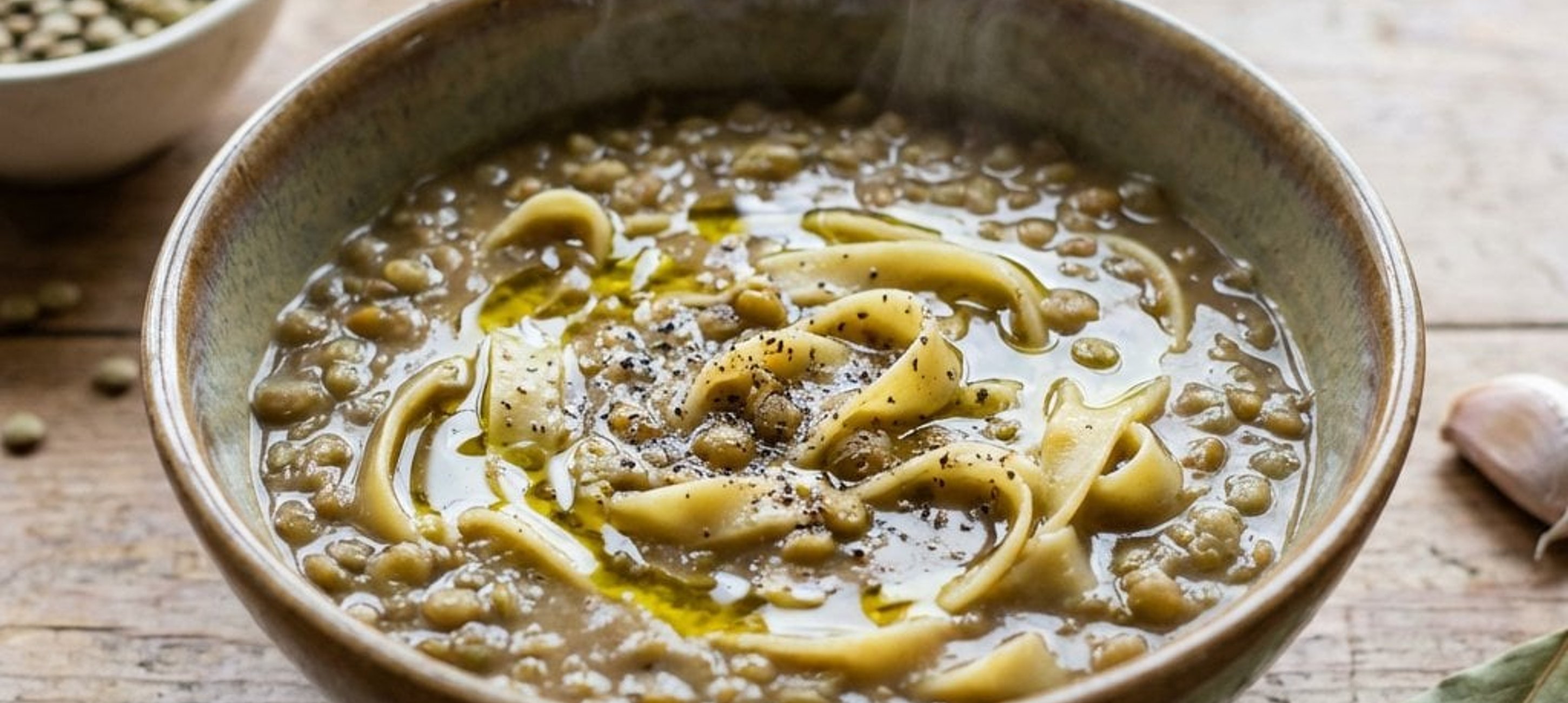 - 2Főzzük a lencsét a fajtájától függően kb. 30 percig, amíg megpuhul. A főzés végén adjuk hozzá a szélesmetélt tésztát, és főzzük rövid ideig, amíg a tészta is elkészül. Végül locsoljuk meg egy kevés extra szűz olívaolajjal. Tálaláskor a tányérban is megcsepegtethetjük még egy kevés olajjal a tetejét.