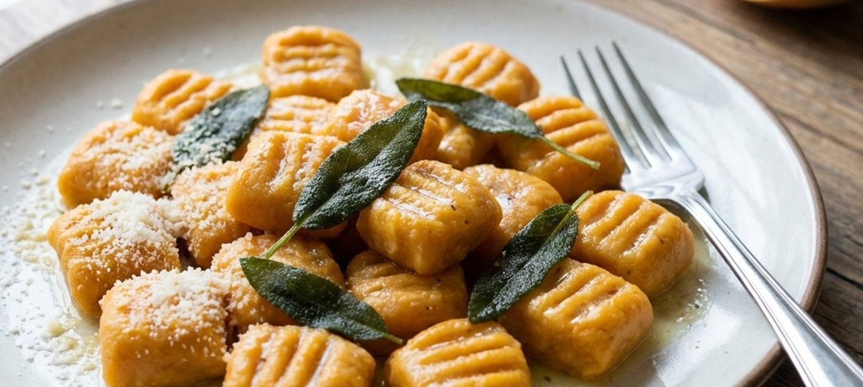 - 3A sütőtökpüréhez adjuk hozzá a tojást, a lisztet, a reszelt parmezánt és a sót. Gyúrjuk össze egynemű tésztává. Lisztezett felületen osszuk a tésztát több részre, formázzunk belőlük hengereket, majd vágjuk kis darabokra. Szükség esetén használjunk további lisztet a szóráshoz. Egy villa hátoldalával alakítsuk ki a gnocchi jellegzetes bordázott formáját.