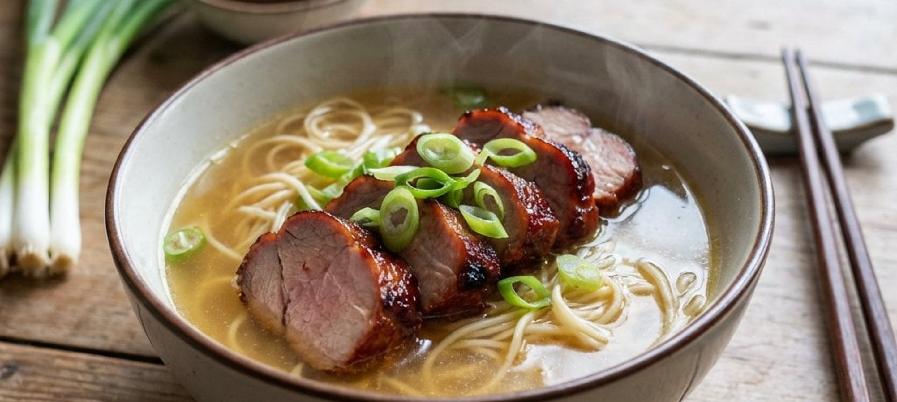 A felszeletelt húst tálalja forró csirkehúslevesben főtt tésztával, és szórja meg friss újhagymával. Így készül az igazi ázsiai Char Siu tésztaleves!