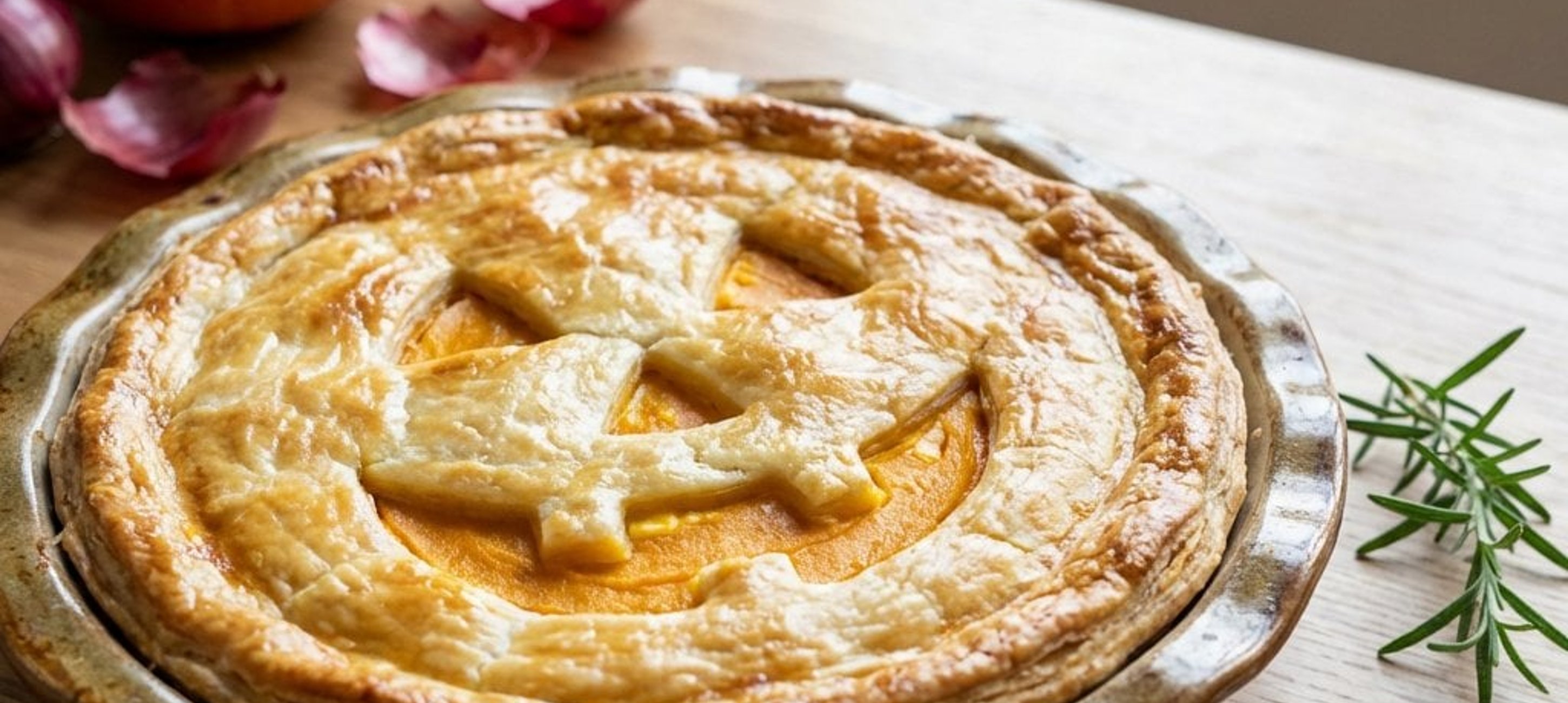 - 3A lilahagymát vágjuk félkarikákra, és a maradék olajon pároljuk aranysárgára. Hagyjuk kihűlni, majd keverjük hozzá a tojásokat és a morzsolt feta sajtot. Adjuk hozzá a rozmaringot és a sült, simára turmixolt tököt. A tökös masszát simítsuk a formába. A tészta másik feléből vágjunk ki szemeket, orrot és szájat (mint egy halloweeni töklámpásnál), majd borítsuk a töltelékre, és a széleit villával nyomkodjuk össze.