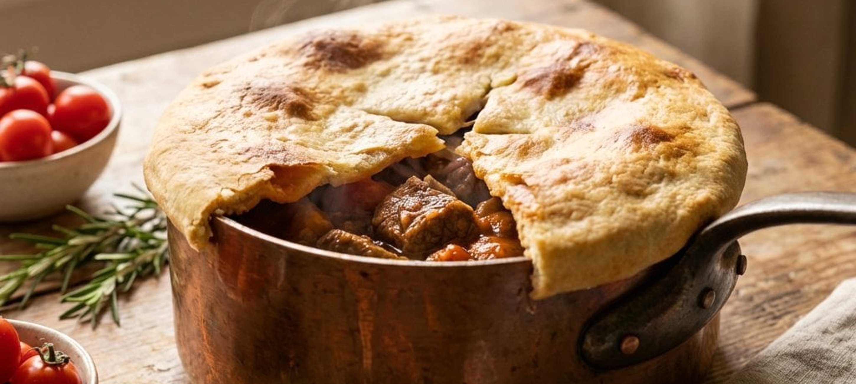 - 6Vegyük ki a lábast a sütőből, vegyük le a fedőt, és helyezzük a helyére a kinyújtott tésztát. A széleit nyomkodjuk a lábas oldalához, hogy jól zárjon. Süssük további 15 percig, amíg a tészta aranybarna és ropogós lesz. Forrón tálaljuk.