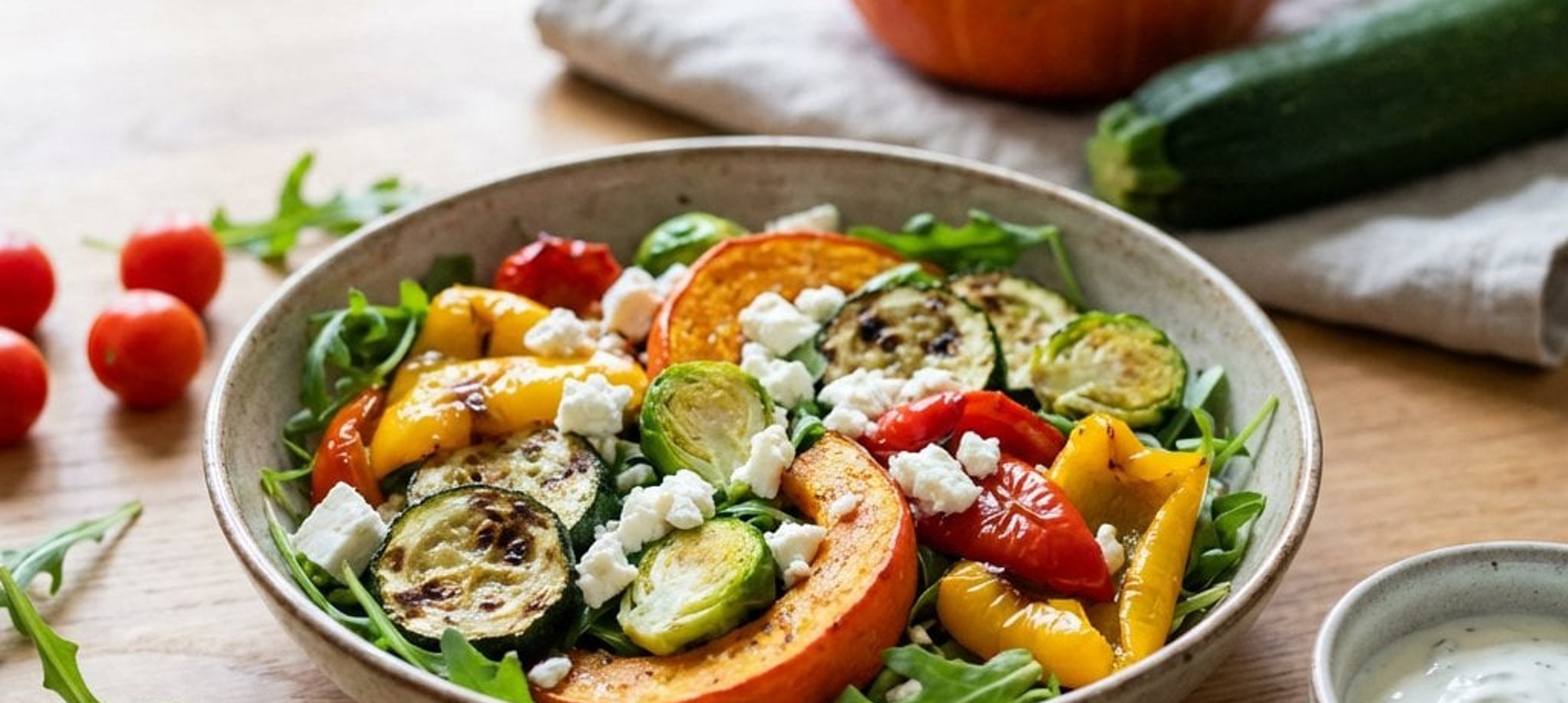 - 3A sült zöldségeket keverjük össze a friss rukkolával és a morzsolt feta sajttal. Tálaljuk a tejfölből, fokhagyma granulátumból, sóból és borsból kikevert mártogatóssal.