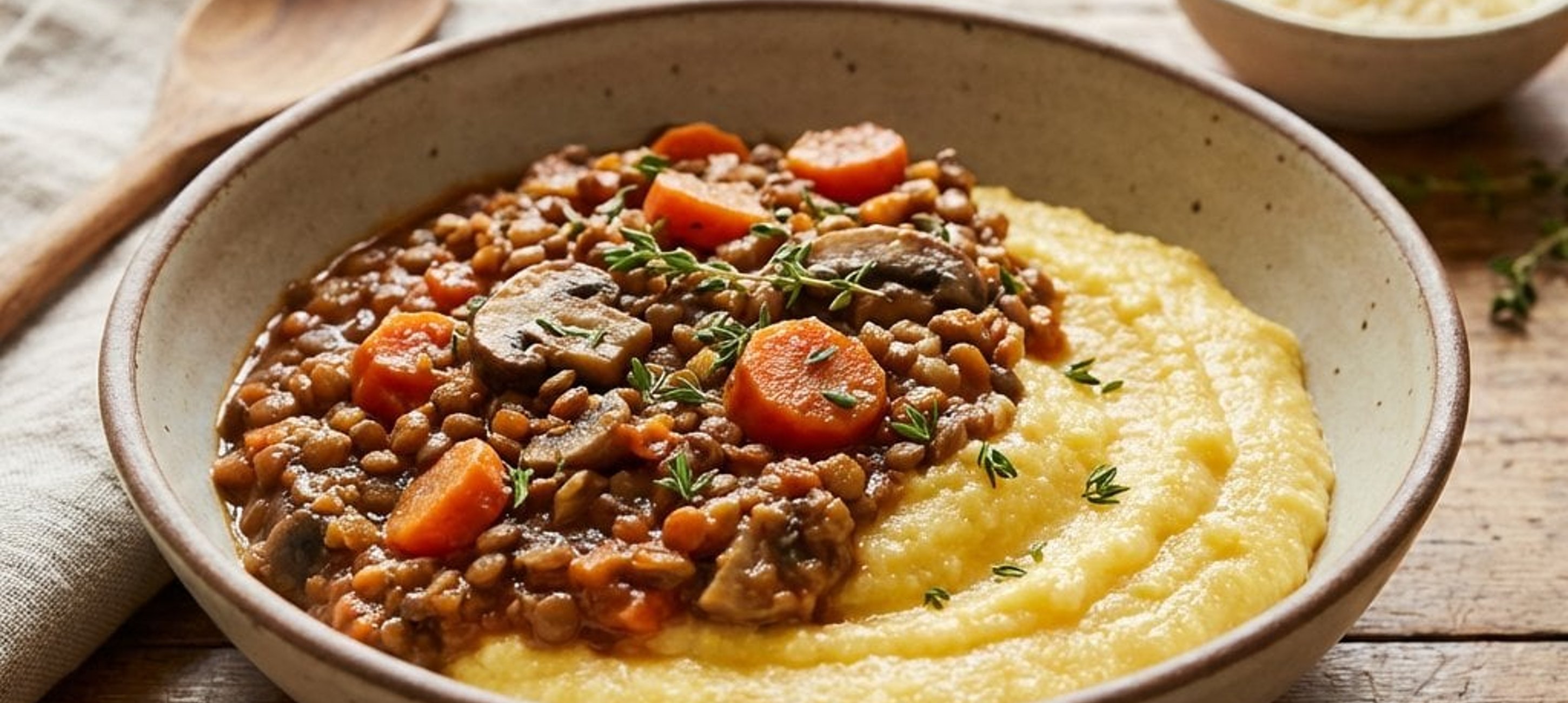 - 4A polentát 900 ml enyhén sós vízben tegyük fel főni. Folyamatos kevergetés mellett főzzük 5-7 percig, amíg krémes állagot kapunk. Tálaljuk a lencseragut a forró polentával.