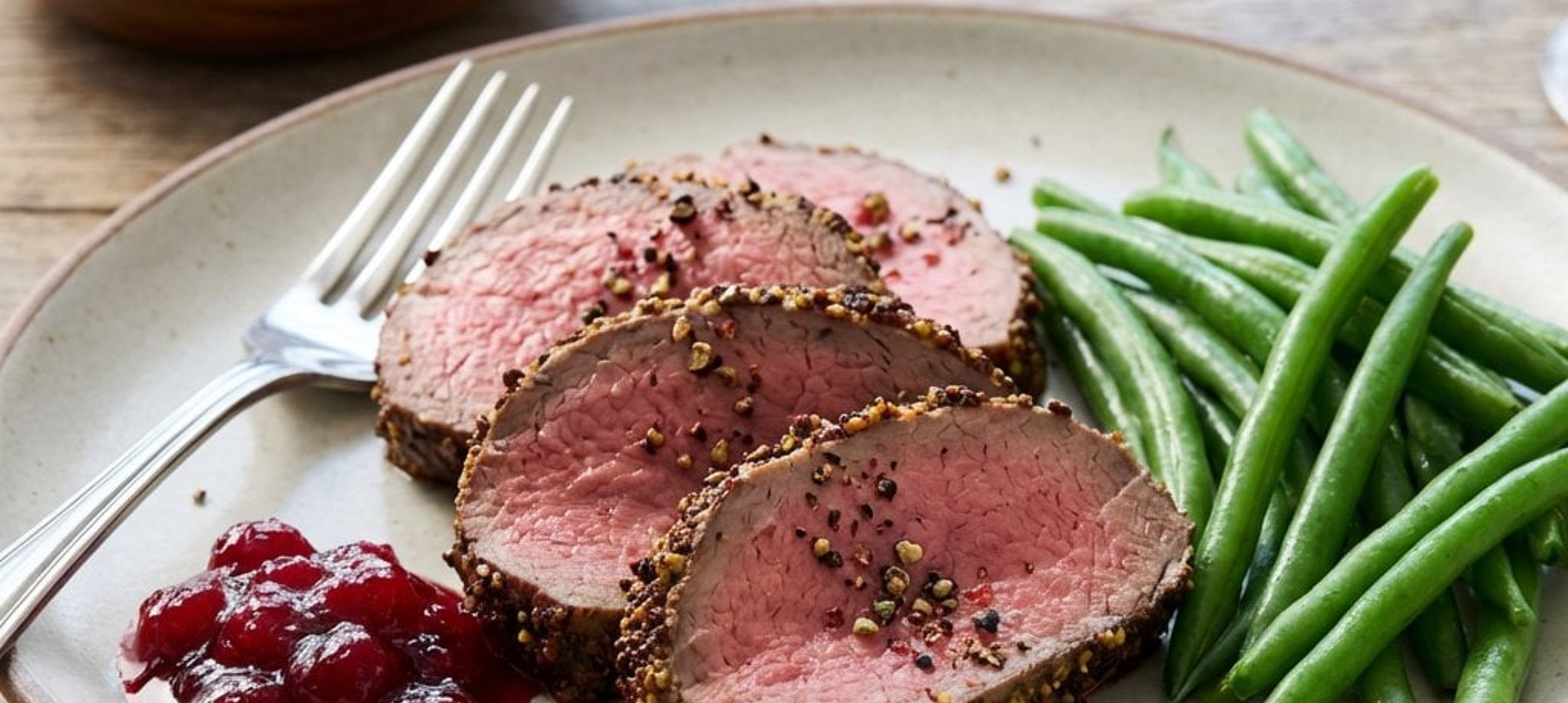 - 2A vékonyra szeletelt roastbeeffet a zöldbabbal és egy adag vörösáfonya-mártással tálaljuk.