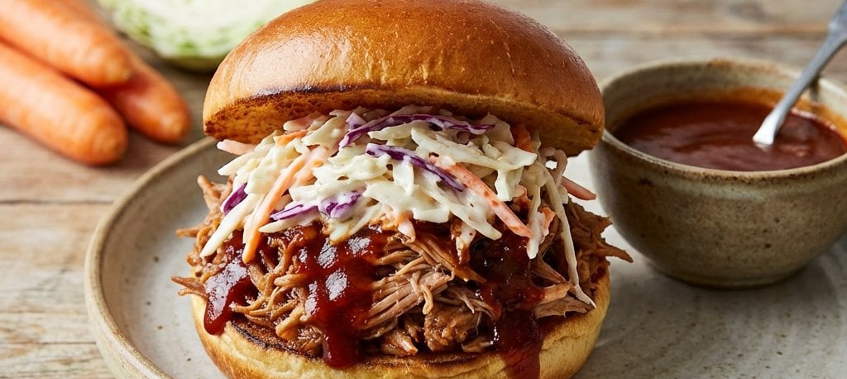 - 2Helyezzük rá a felmelegített tépett sertéshúst. A húsra tegyünk tetszőleges mennyiségű coleslaw salátát.