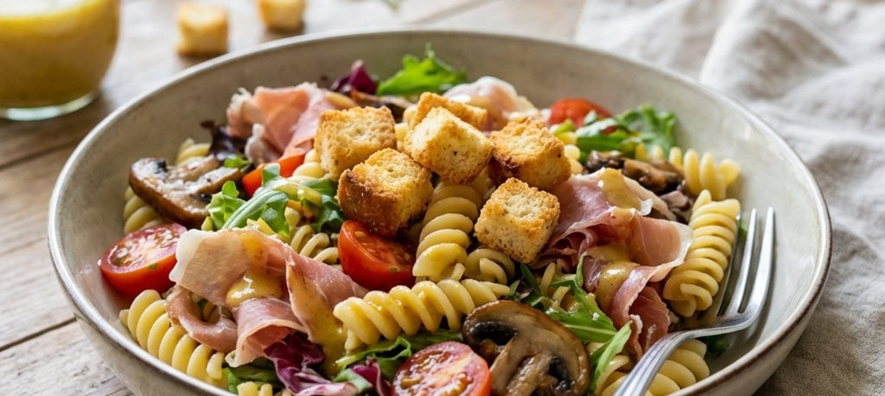 - 6Egy nagy tálban keverjük össze a tésztát a paradicsommal, a salátakeverékkel és az öntettel.