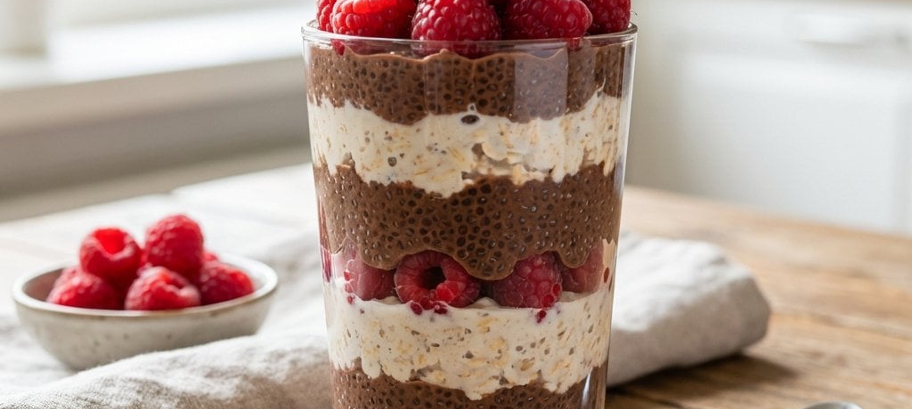 - 2Egy kb. 200 ml-es magasabb falú pohárba rétegezze bele először a zabpelyhes keveréket, majd szórja rá a málna felét, végül öntse rá a csokoládés chia pudingot.