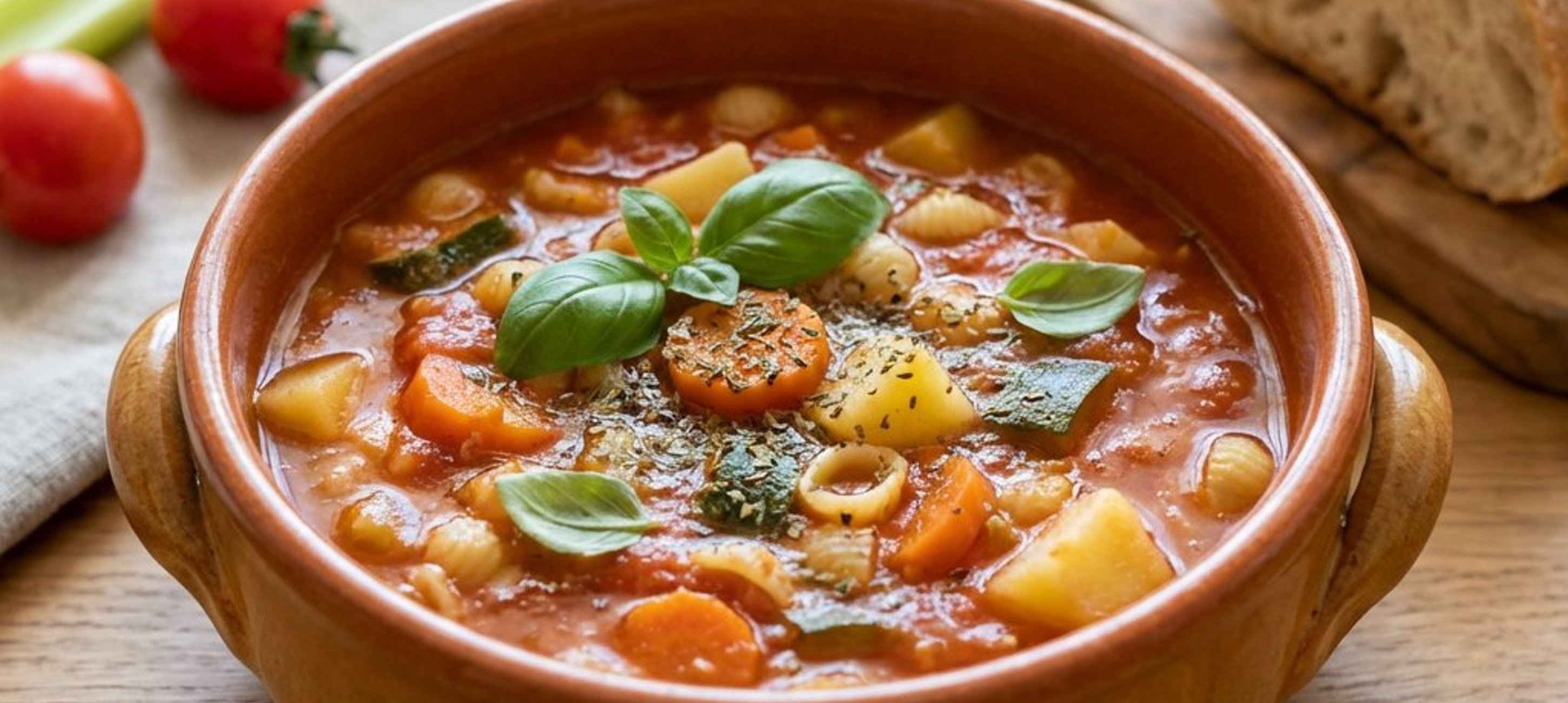 - 3A pirítás után adjuk a fazékhoz a felkockázott paradicsomot, a sűrített paradicsomot, a tésztát, 1 liter zöldség alaplevet, a szárított bazsalikomot, az oregánót, sót és borsot. Forrástól számítva főzzük közepes lángon 13-14 percig. Amint a zöldségek megpuhultak, vegyük le a tűzről.